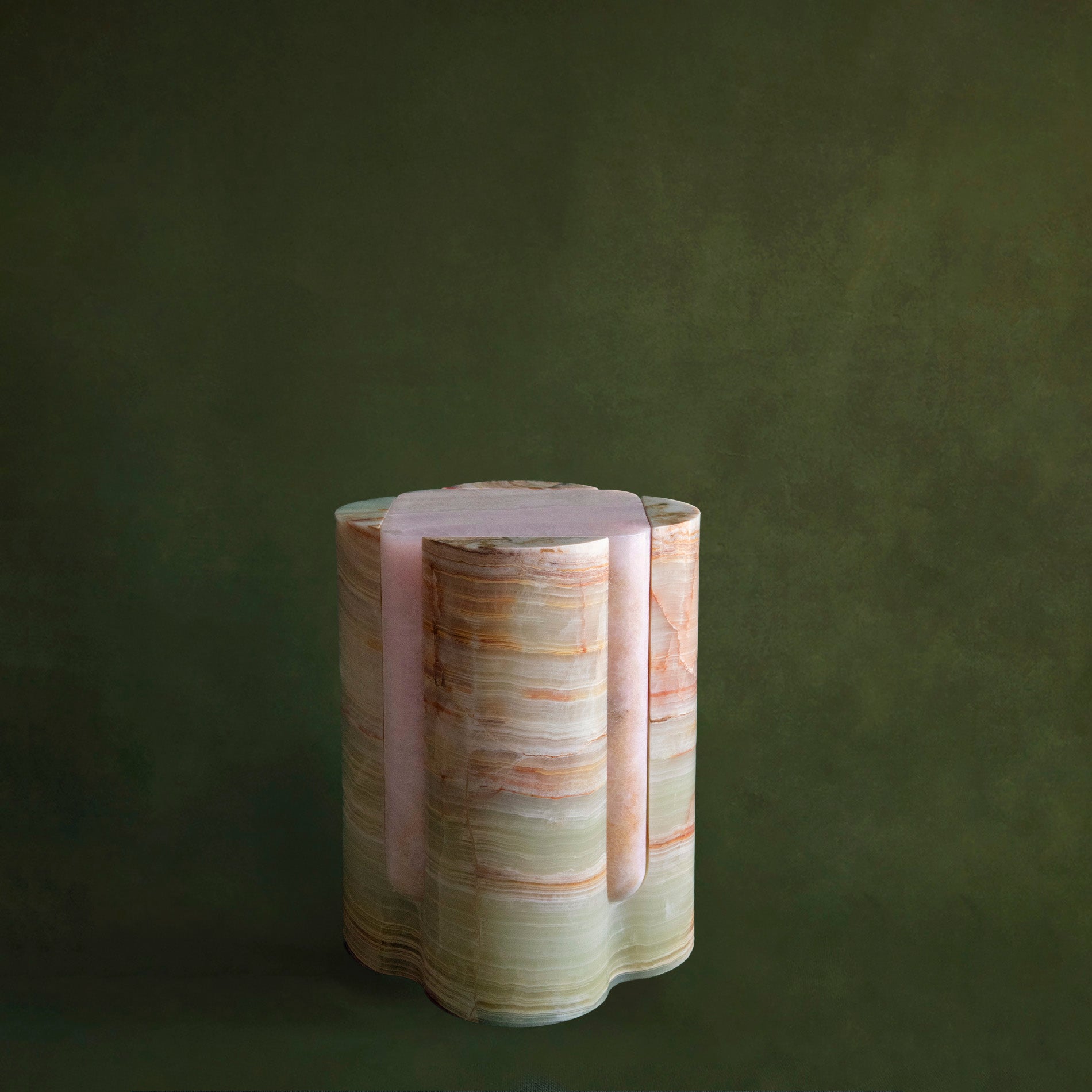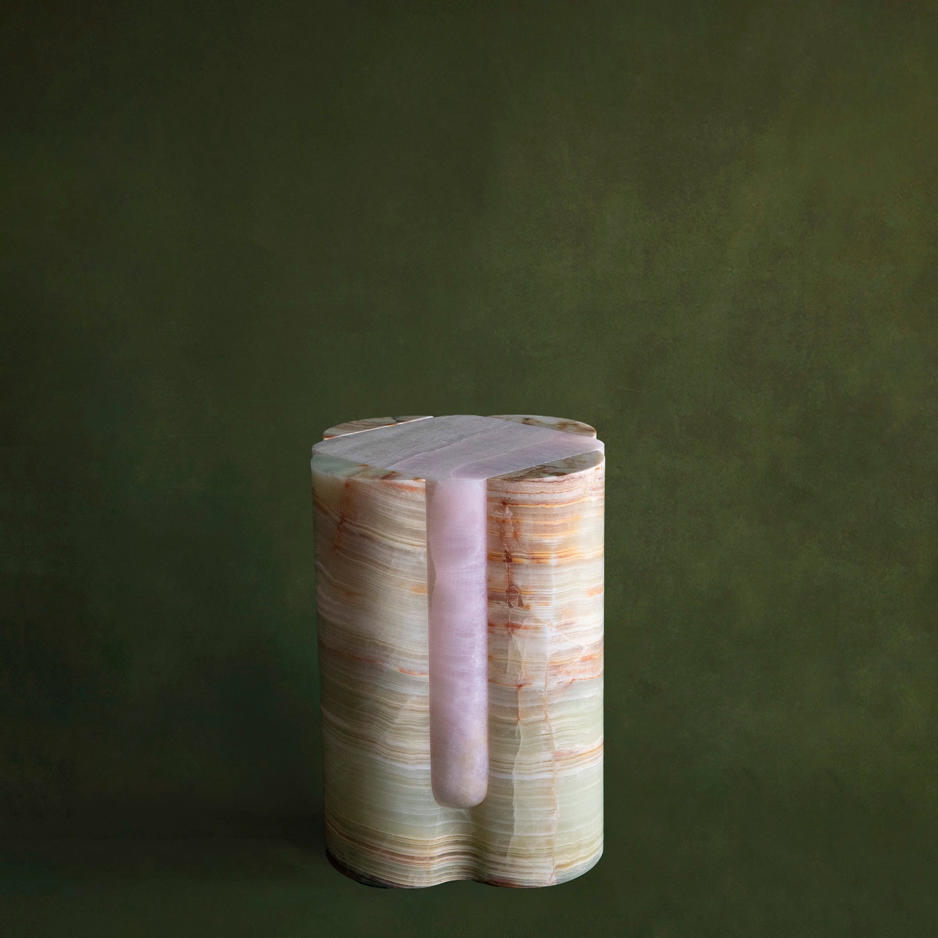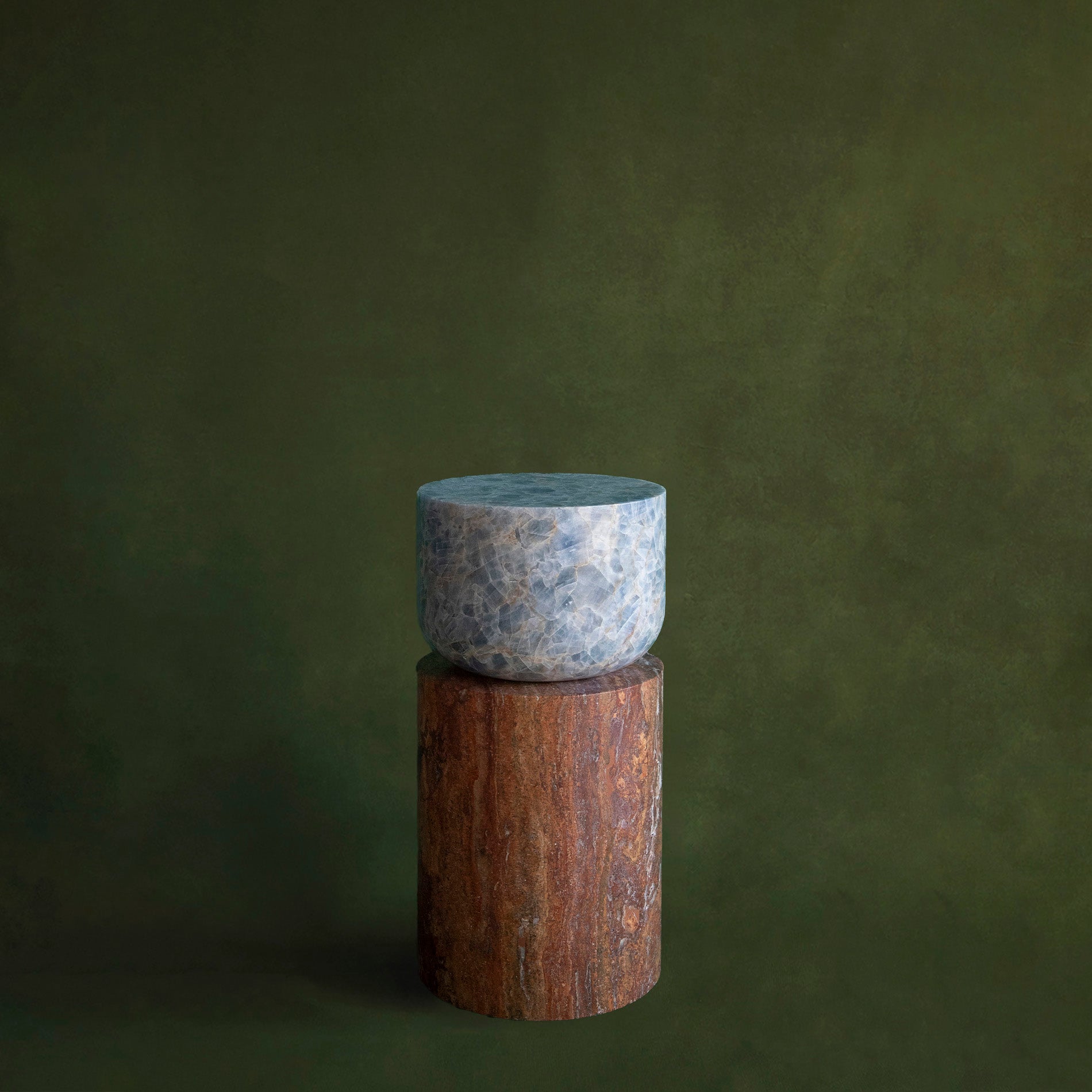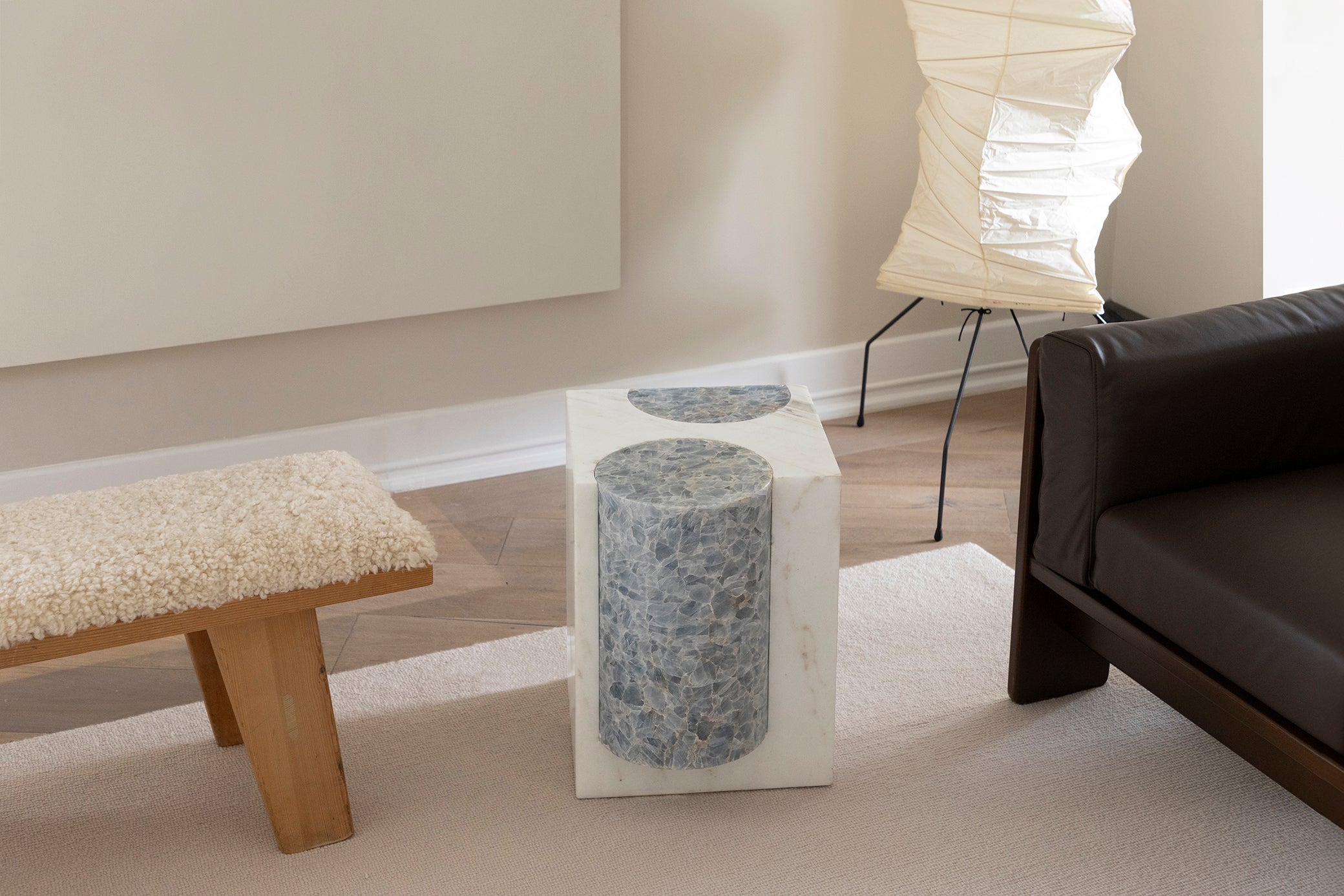 Driven by the perfection of geometry, the stools follow a positive/negative assemblage: The marble is elevated at the center of the base and, by way of gravity, slides into the natural colored stone, fitting into it as a piece from a puzzle. The harmony between their shapes binds them and creates a unit that will defy the passing of time.