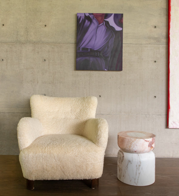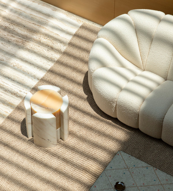 While, in principle, marble bears not a volcanic origin, the veiny, fine-grained Yule marble employed for this variation of Sten Studio’s distinctive stools is quarried from the profound interior of the Elk Mountains of Western Colorado. Due to this highly peculiar source –the very entrails of a mountain range– this kind of marble has accrued its current shape, from prehistoric times onward, by contact metamorphism. That is, the rock mineral is changed, as its texture, by the heat provoked due to contact with magma. The outcome is a distinctive tinged appearance that contrasts with the unmasked porosity of the grey lava stone.