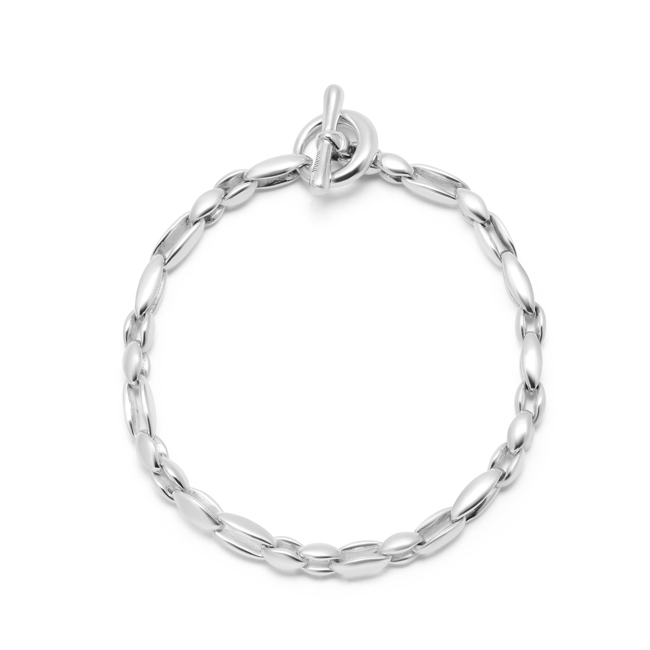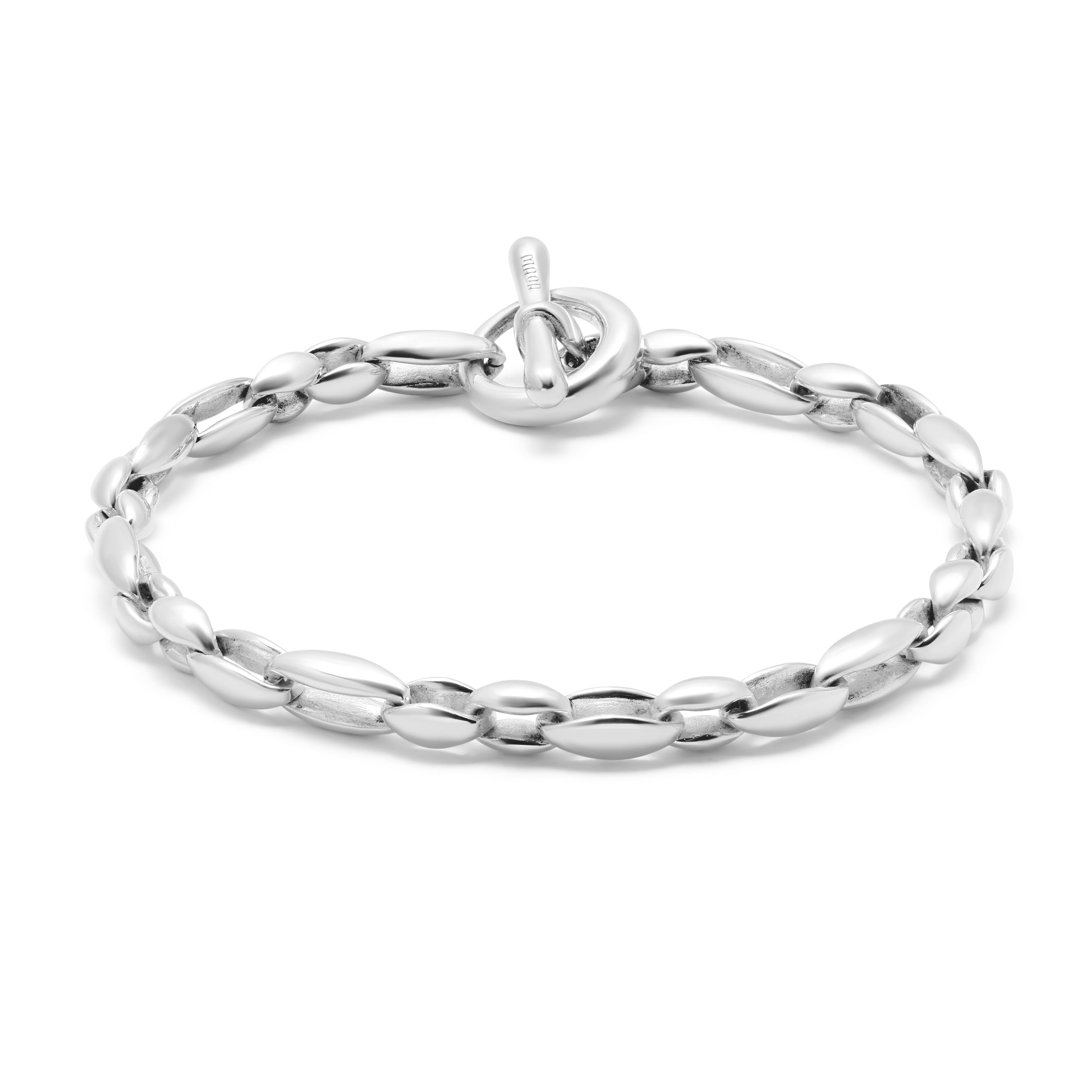 The Bradoon Bracelet features solid, sterling silver links for a timeless and elegant look. Crafted with expert precision, the medium mixed link design adds a touch of sophistication to any outfit.