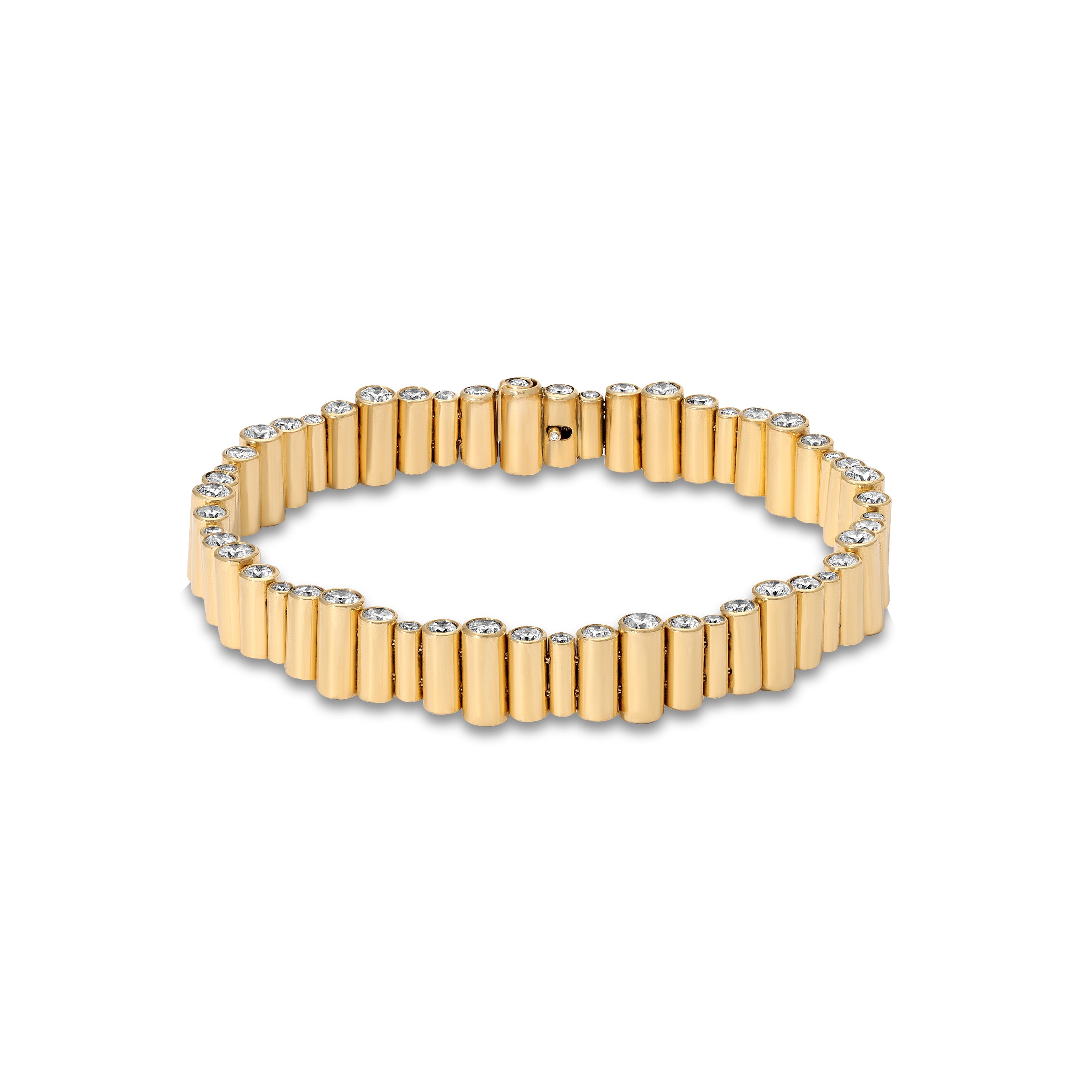 Sought out as the one of the most significant item of the MAOR collection, the mixed-sized cylinders form a seamless and moving illusion when worn. On its edge are white diamonds in various sizes placed elegantly. Wear as a true statement piece or as part of a great stack.