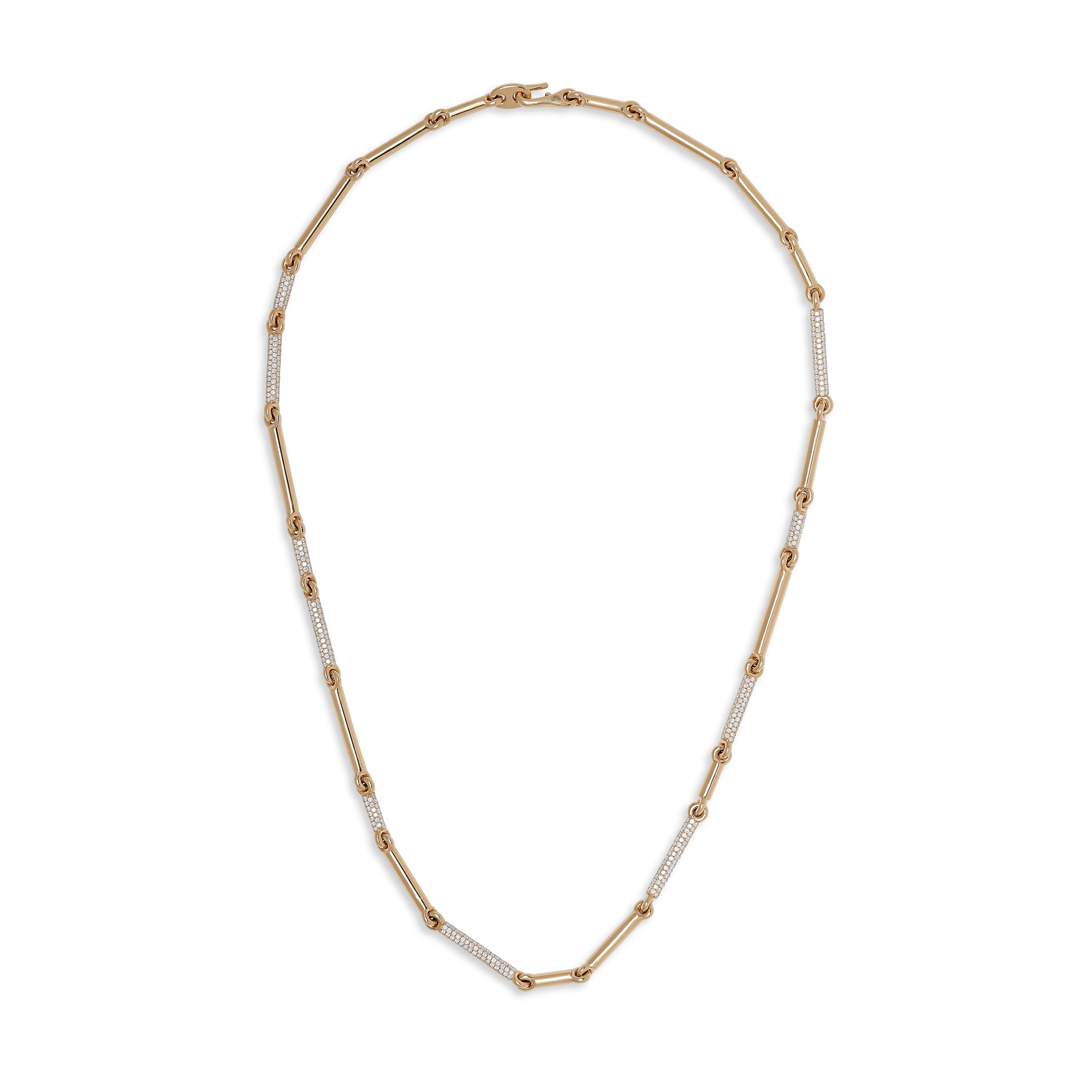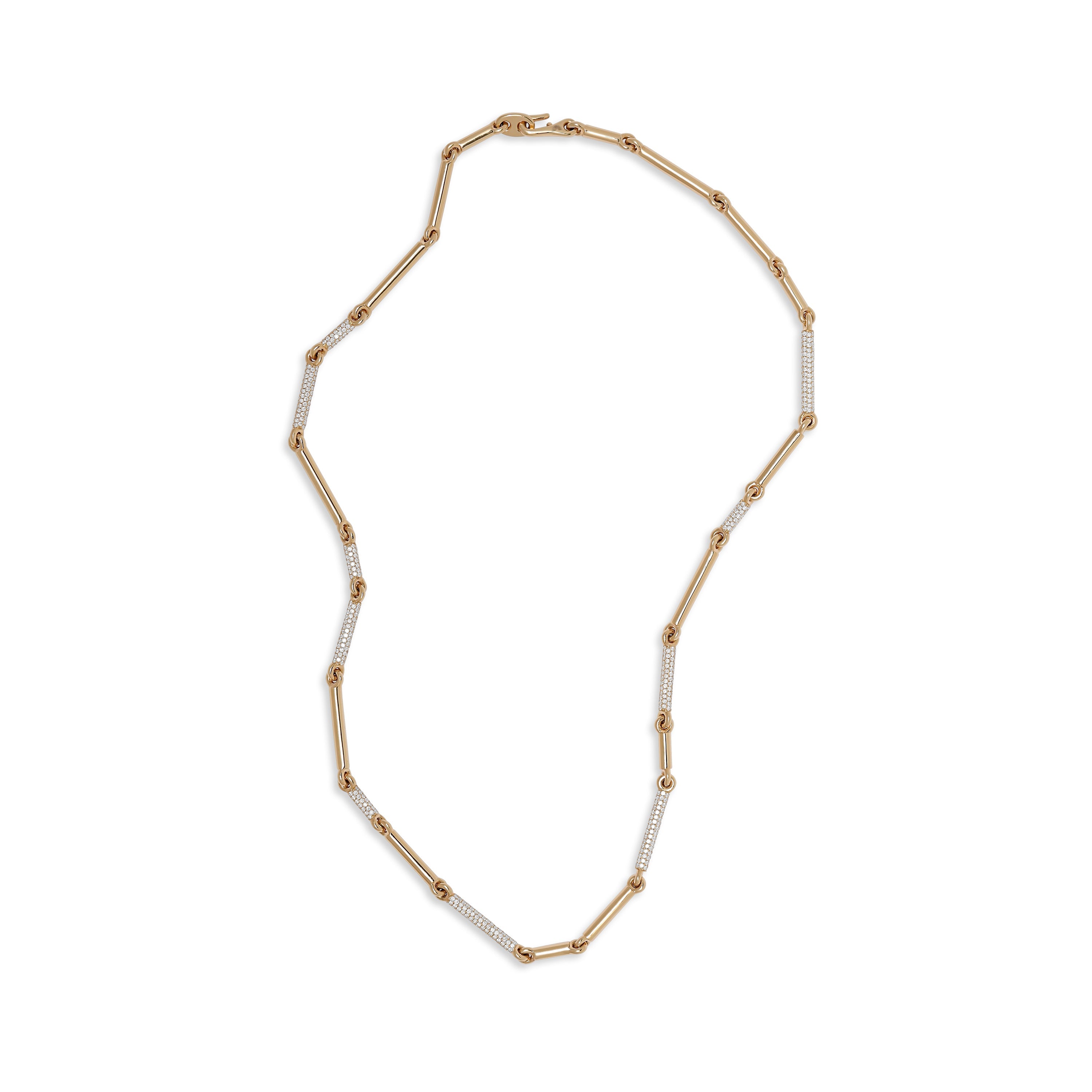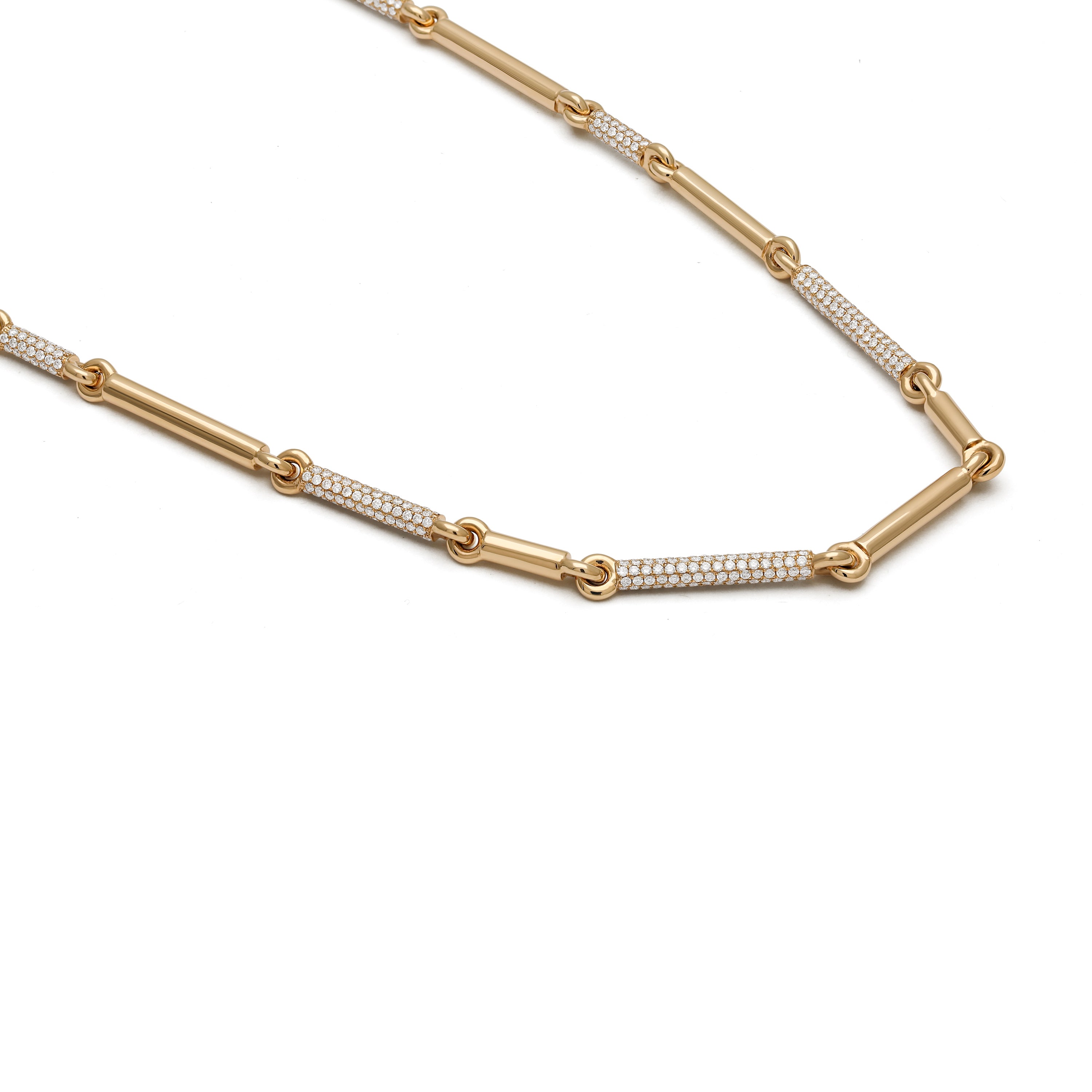 Drawing on the power of the constellations, the uniquely unrepeated length of its bars makes this piece a statement as elegant as the cosmos are vast. The honeycomb pave diamond bars float effortlessly between links of solid 18k yellow gold. Wear this Orion as a solo statement piece or elevate any stack of complementary Necklaces.