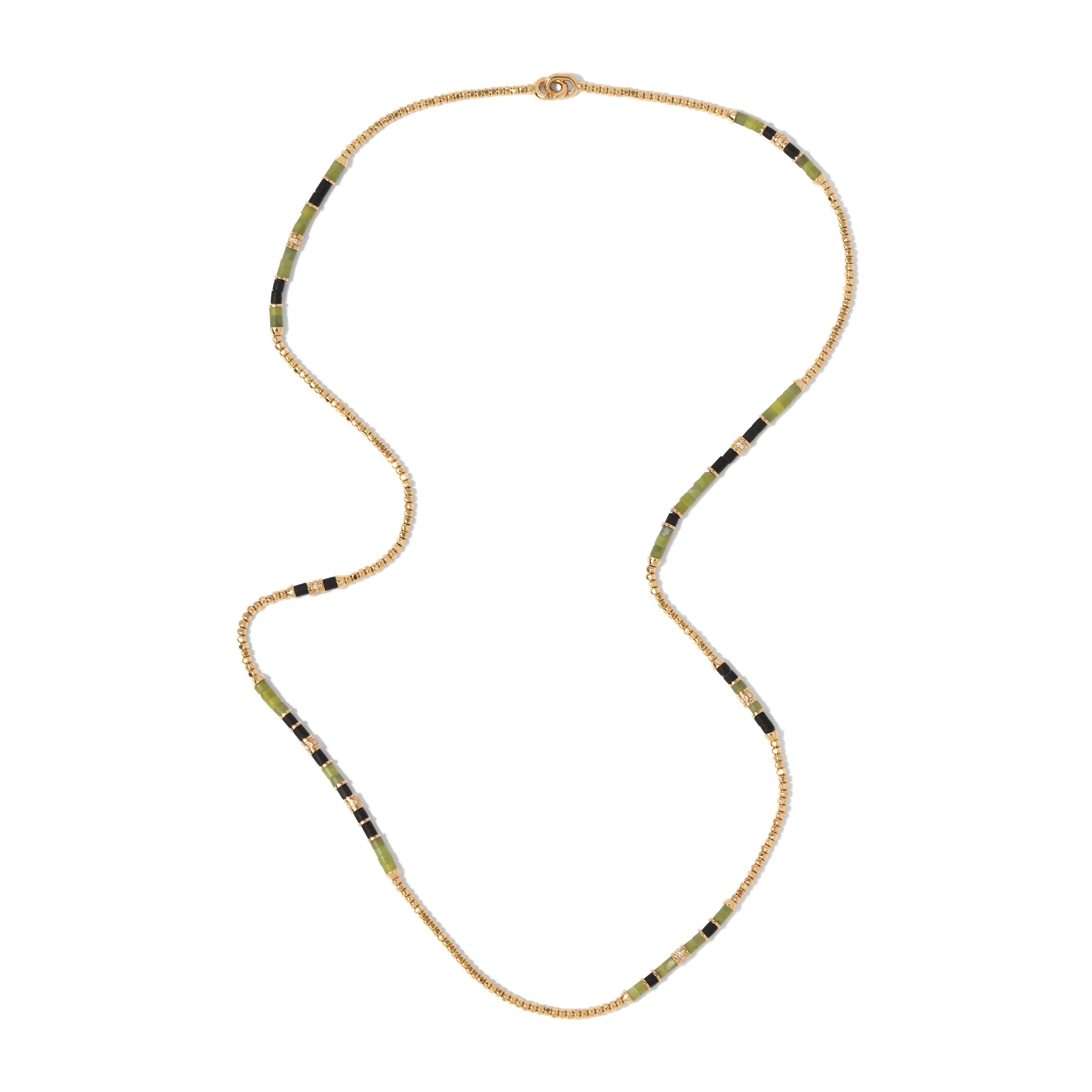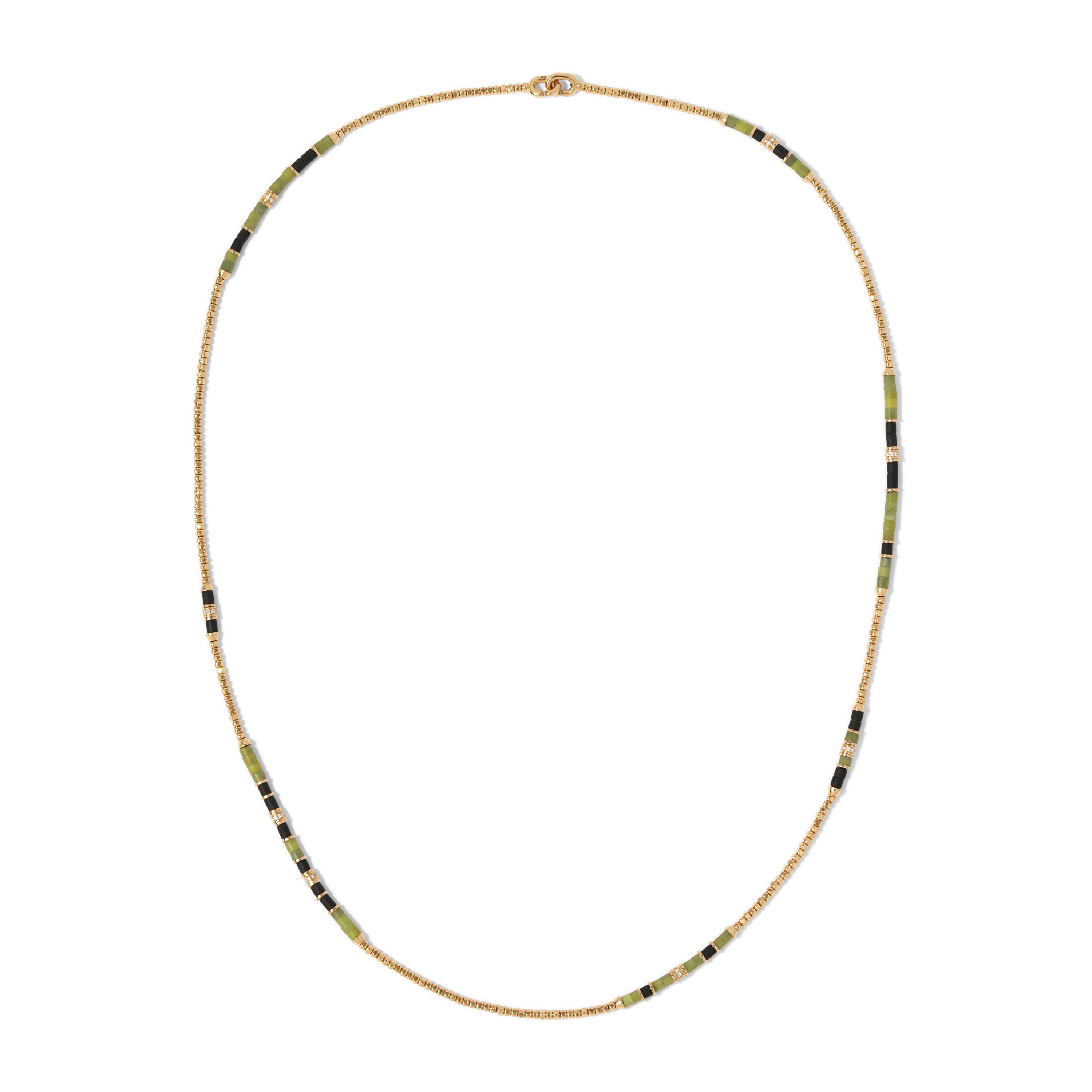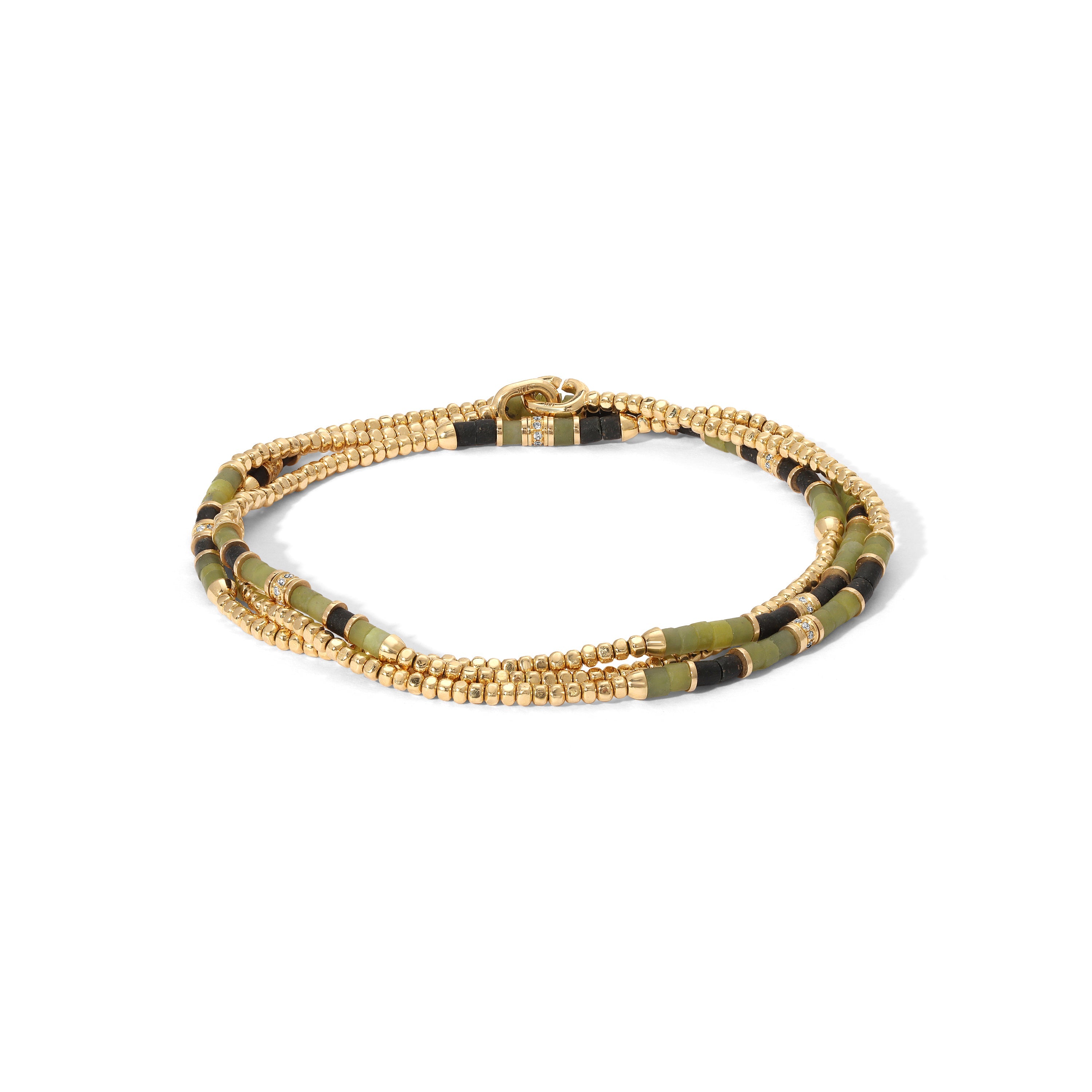 The Creosote is a beautiful piece that provides a subtle addition of color and be worn as a necklace or bracelet. Made with fine green-pattern Afghan Jade, 18k yellow gold and white diamond bead accent, it can be paired with any of your favorite MAOR Necklaces or as a base for your stack.
