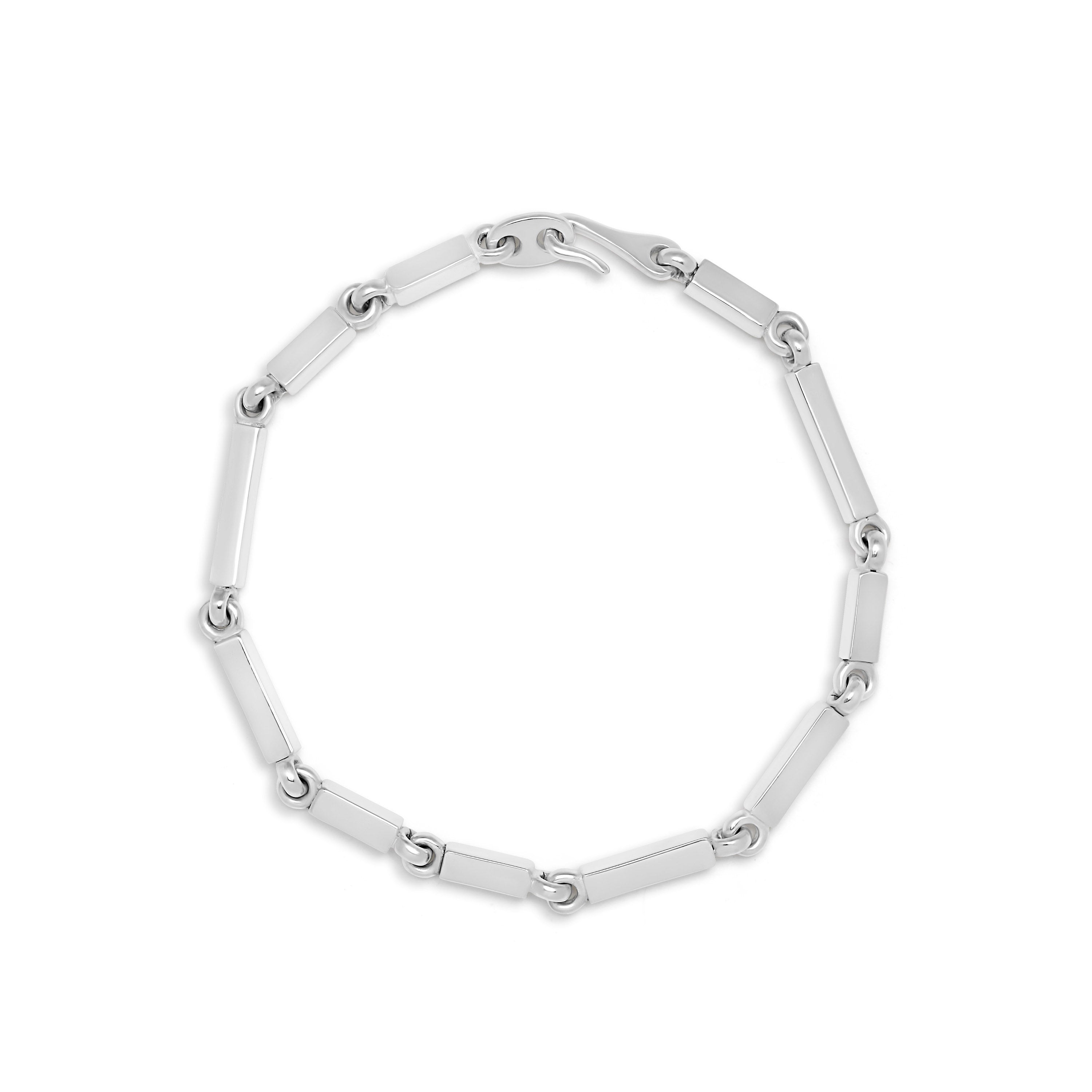 Embracing the design of the interlocking square bars of varying sizes, the 925 sterling silver Cuadrangular bracelet is a unique statement piece. Wear it solo or stacked with a MAOR bangle and beaded bracelet.