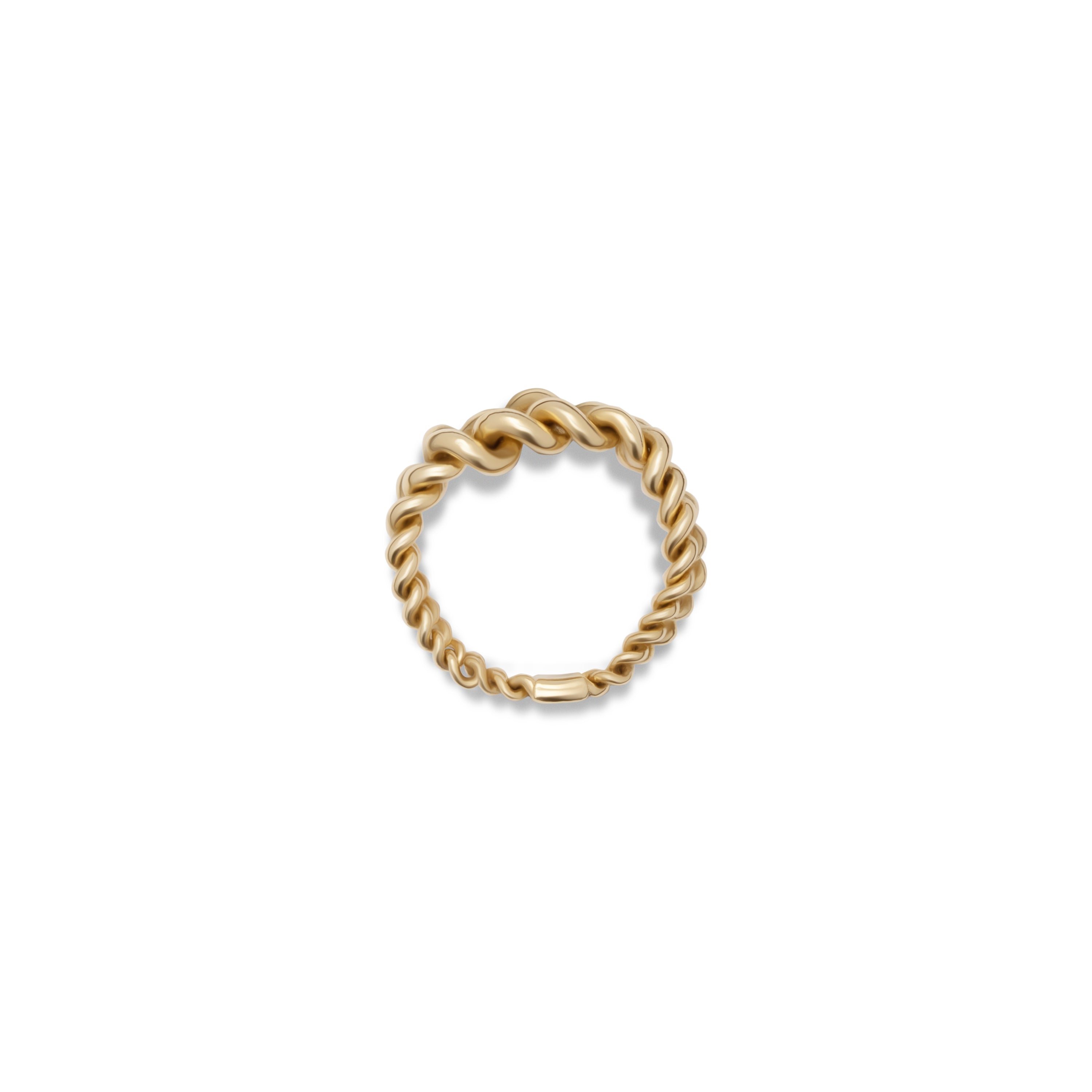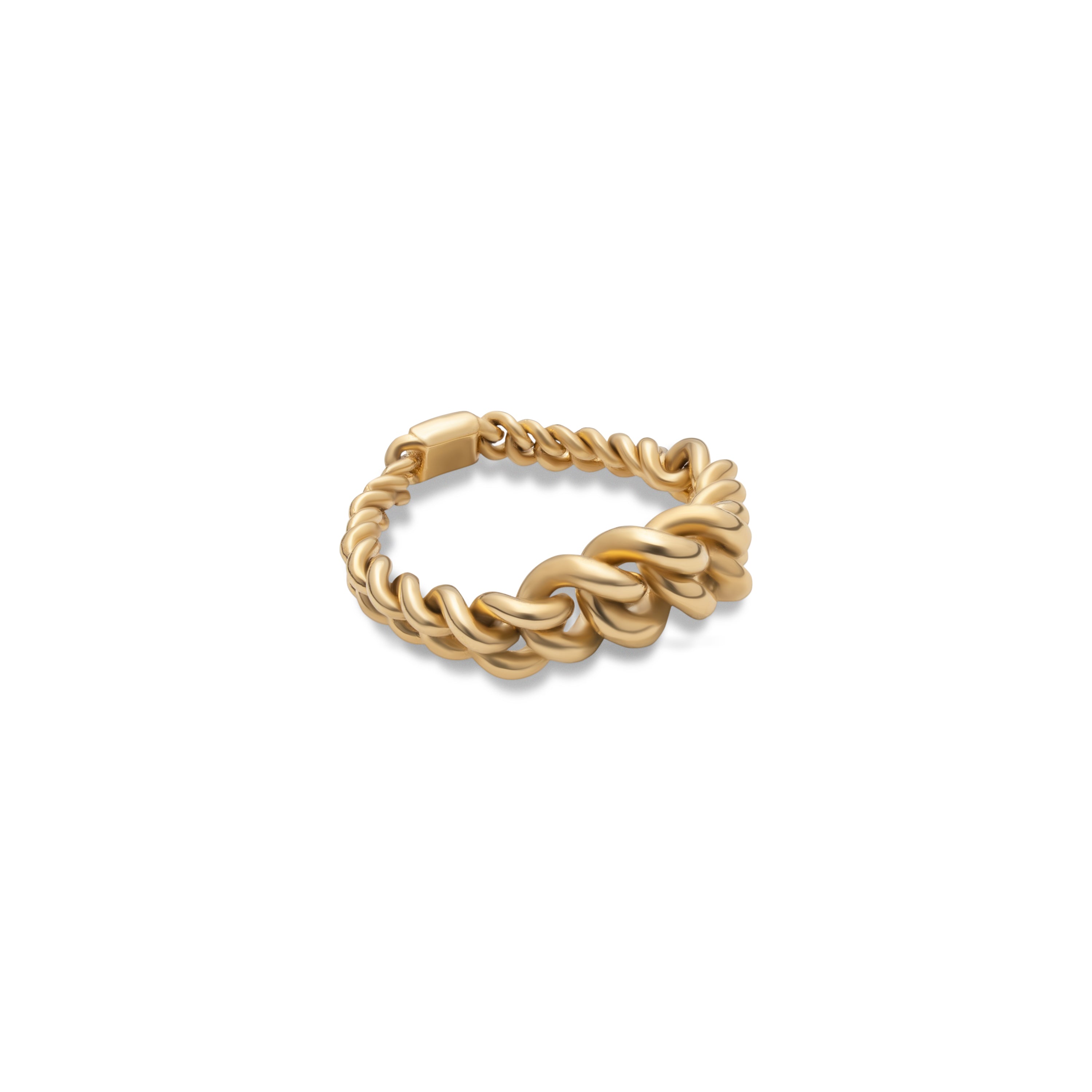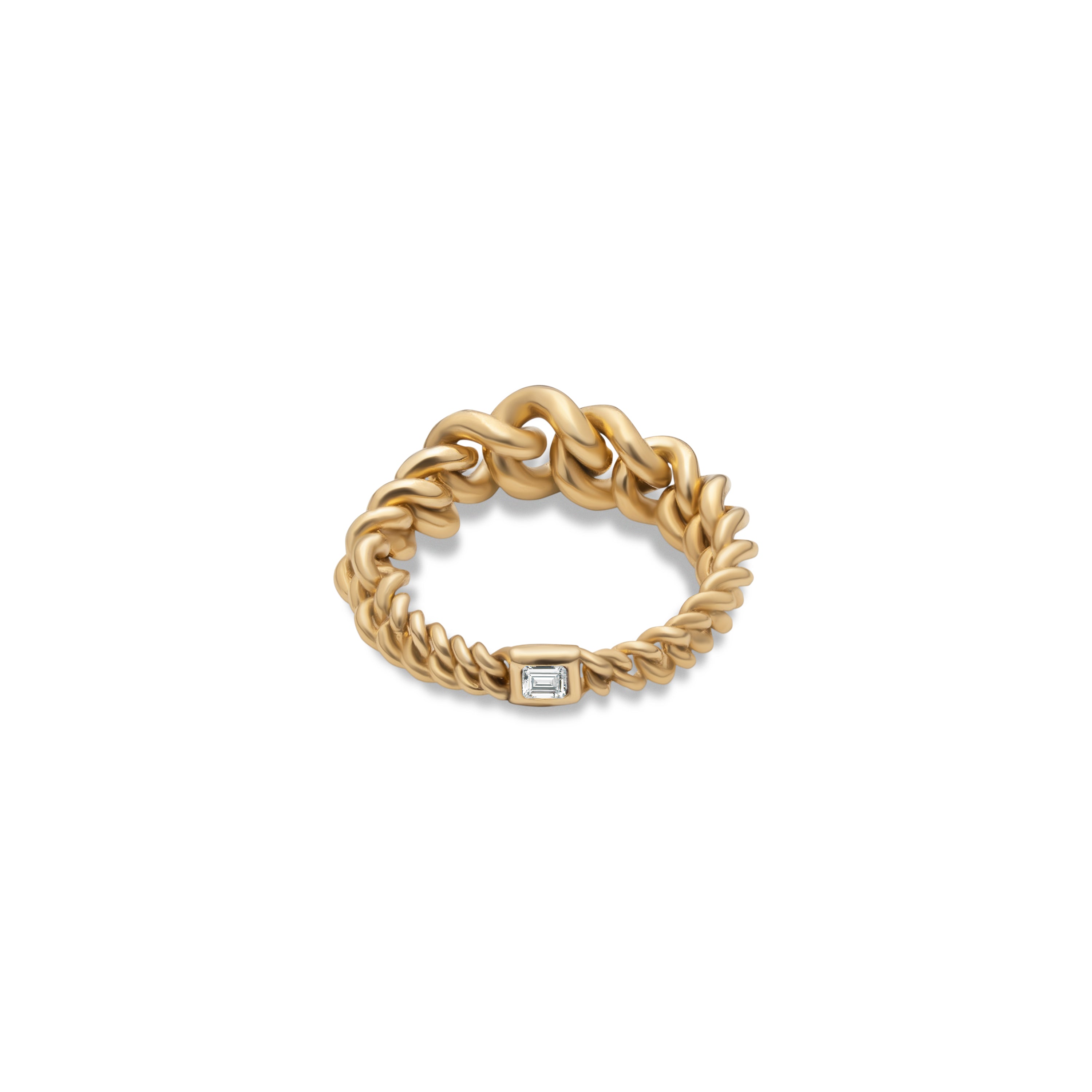 Equal parts sophisticated and tough, here in medium thickness makes a bold statement. Fluid linked solid 18k yellow gold chain links in graduated sizing wrap the finger with a baguette white diamond accent on the back. We suggest stacking with band rings.