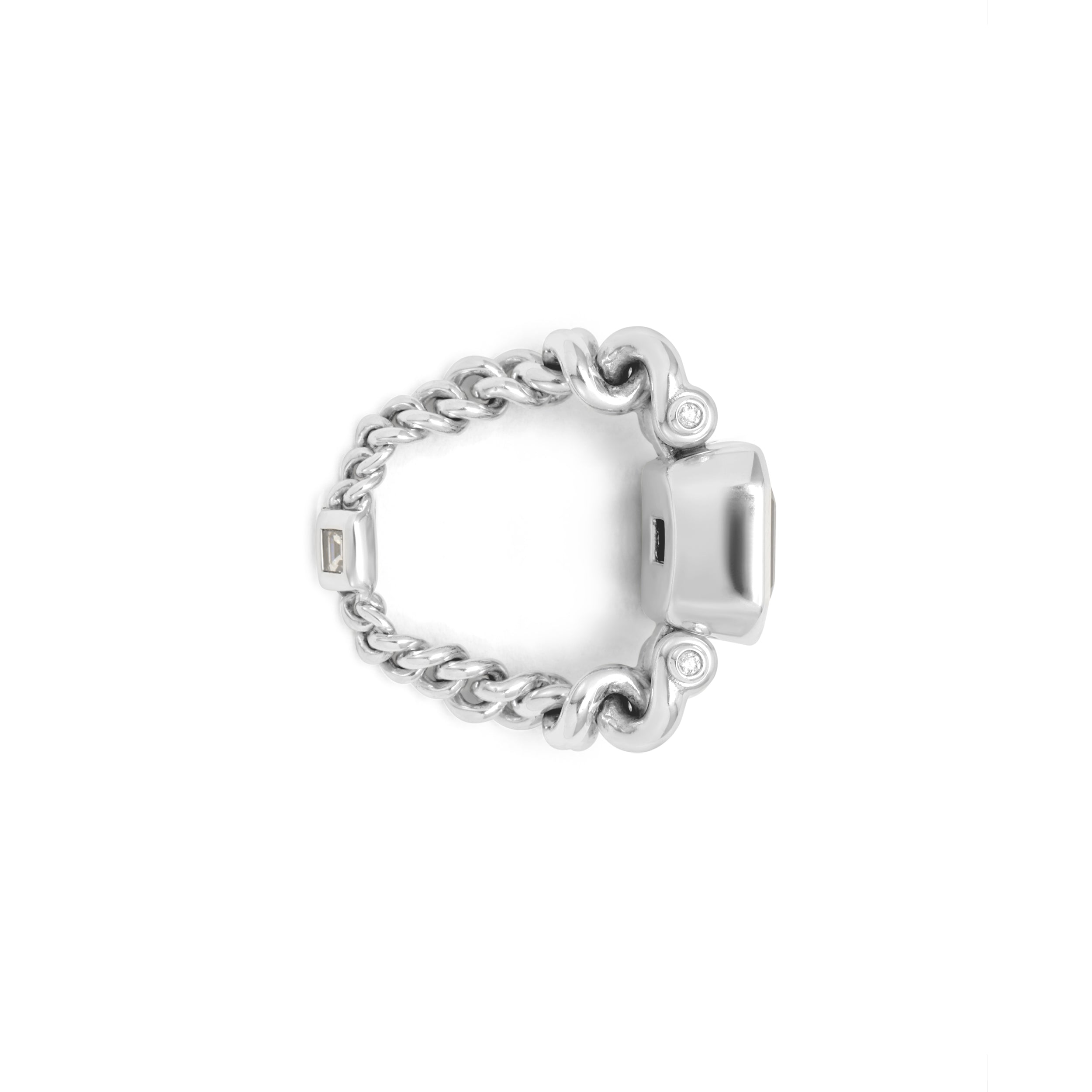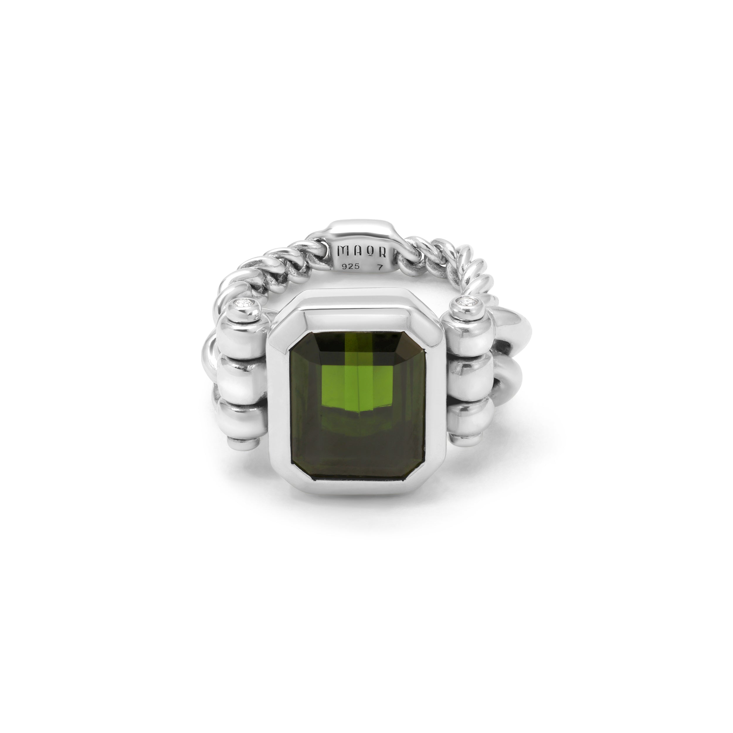 This expertly crafted curb chain ring features 925 sterling silver adorned with vibrant green tourmaline and sparkling white diamonds. Its intricate small-scale design combines contemporary elegance with timeless durability, offering a refined accessory that enhances any look with subtle color and brilliance. Perfect for those seeking both style and quality in fine jewelry.