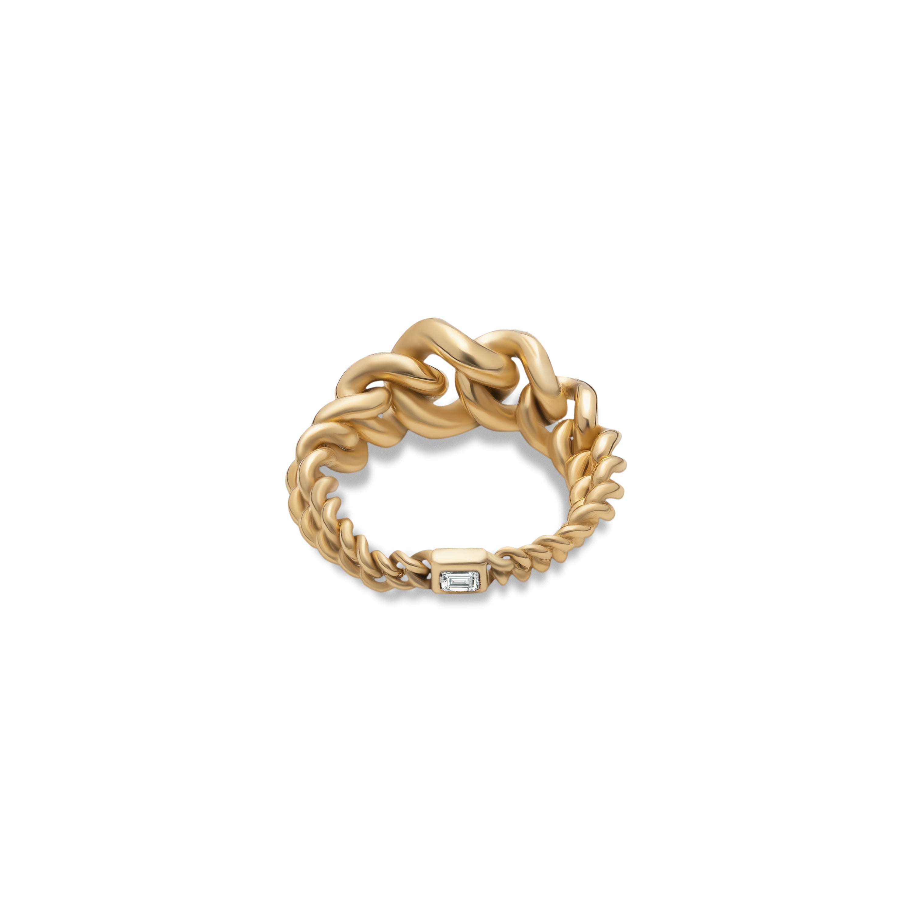 Equal parts sophisticated and tough, here in small thickness makes a bold statement. Fluid solid 18k yellow gold chain links in graduated sizing wrap the finger with a baguette white diamond accent on the back. We suggest stacking with band rings.