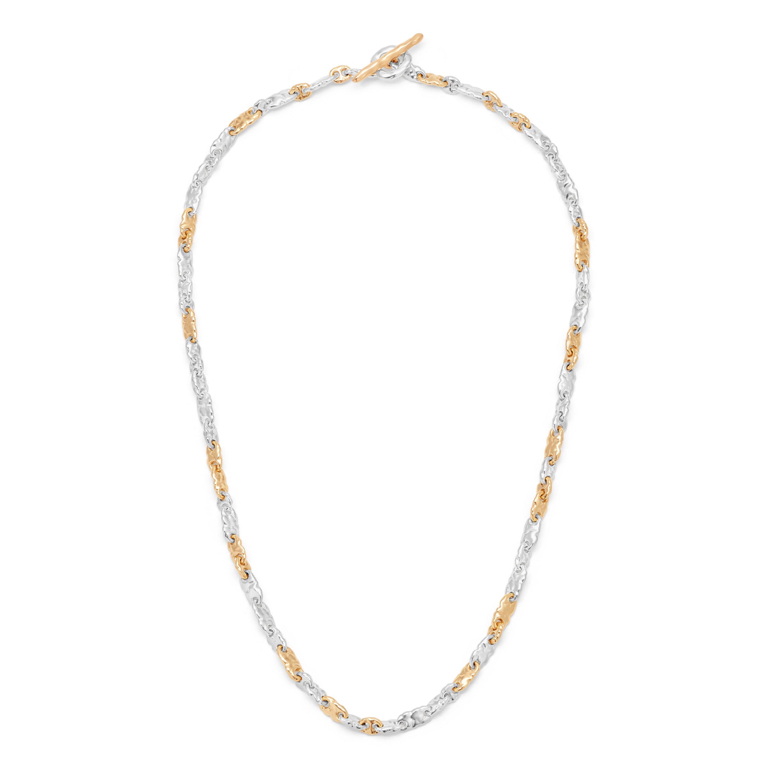 Expertly crafted with a substantial 5mm thickness, the Dali Necklace features a sophisticated blend of solid 18k yellow gold and premium 925 sterling silver. This mixed metal design ensures both durability and timeless elegance. Its secure closure offers reliable wear, making it an ideal accessory to elevate any ensemble with refined style.