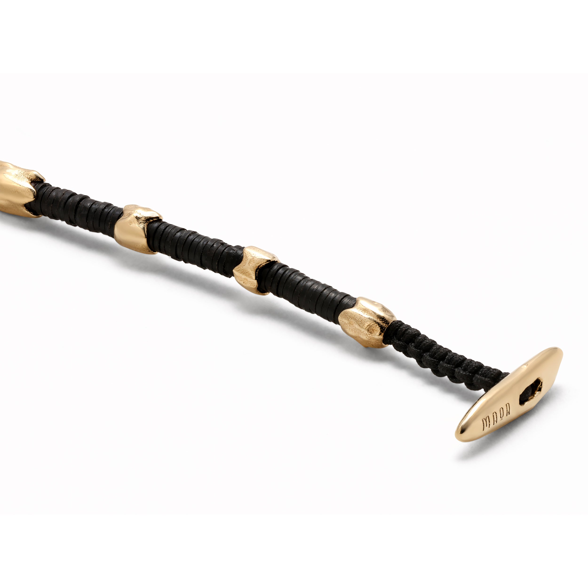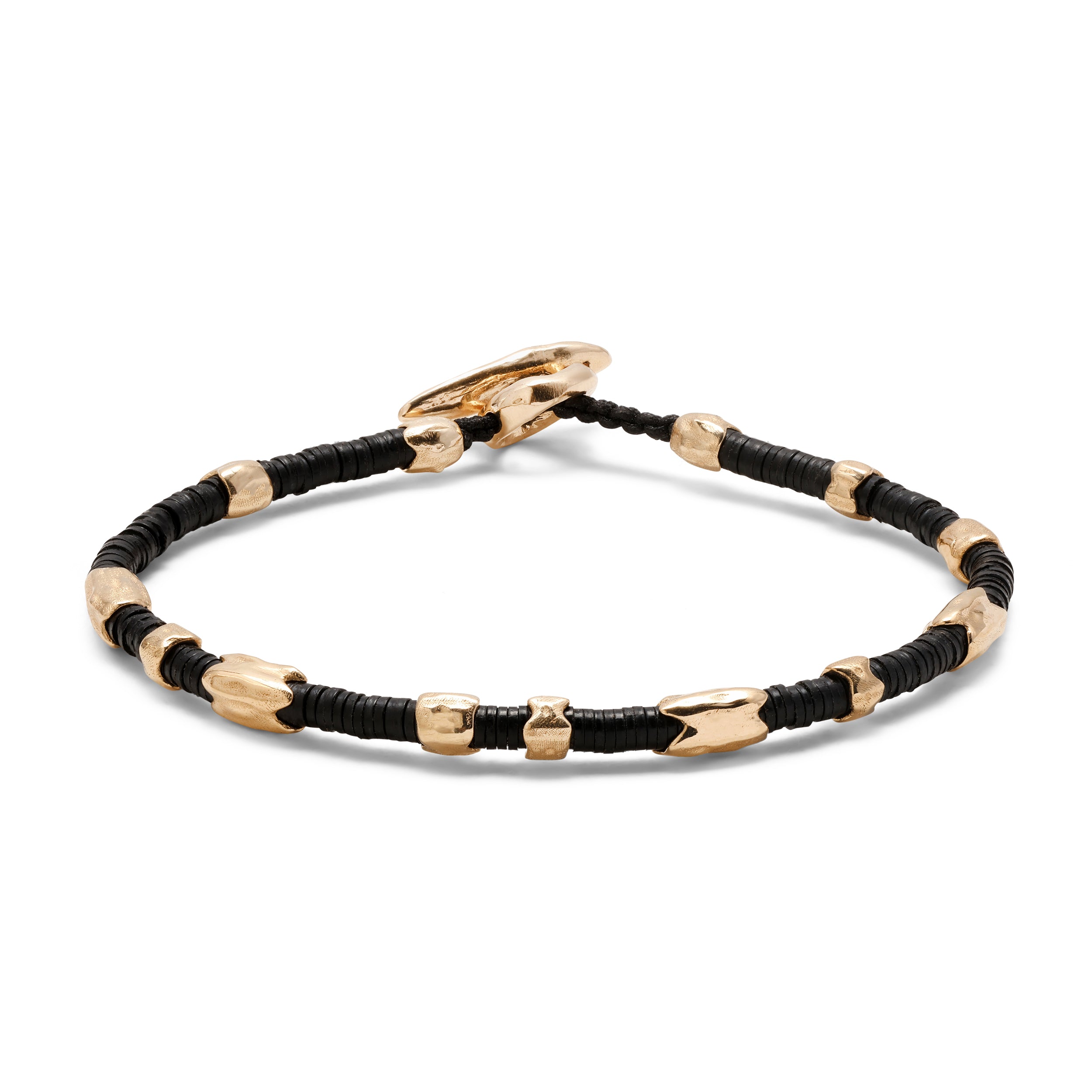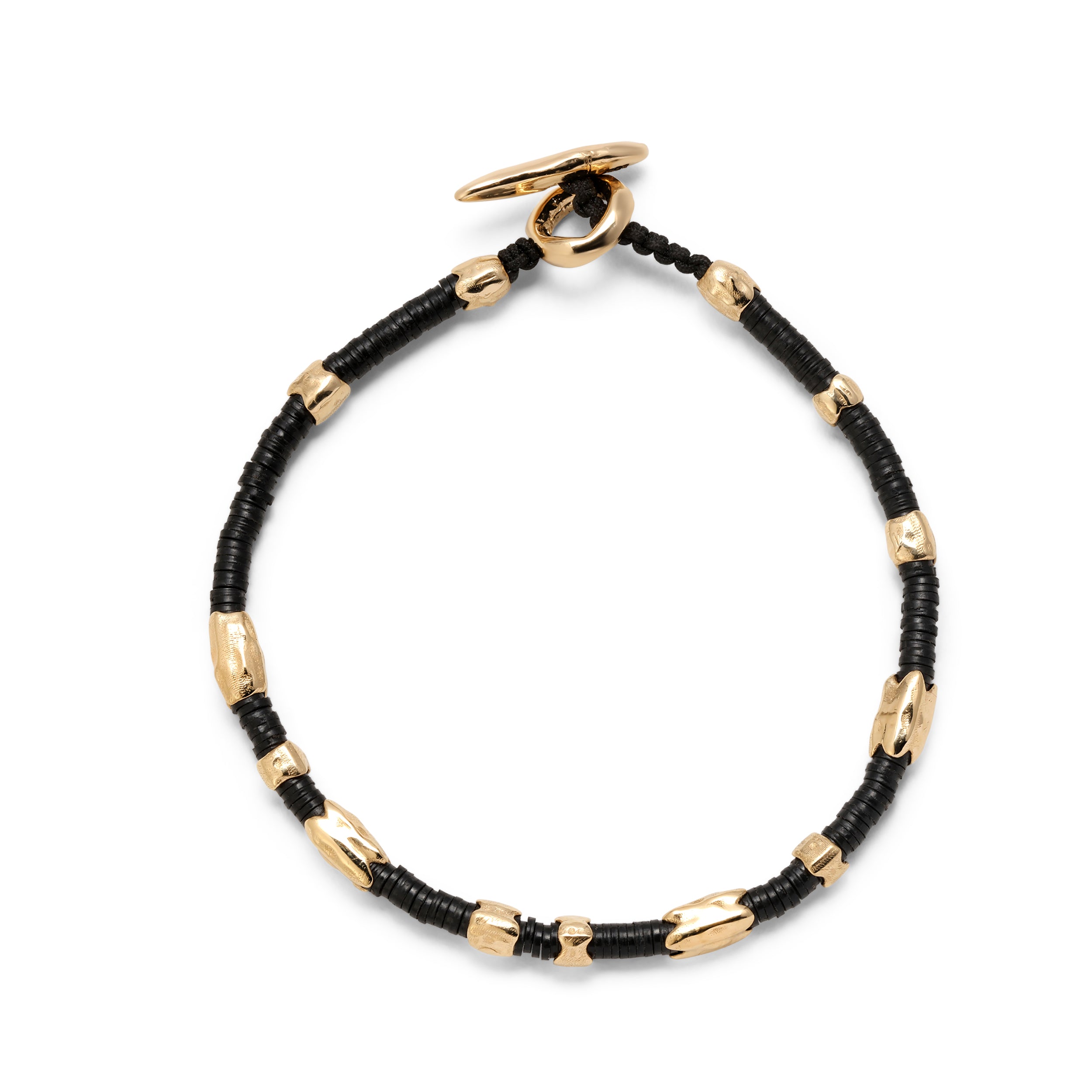 Get ready to make a bold statement with the Dryp Bracelet in black and yellow gold. Made with authentic African vinyl beads and finished with a sleek 18k yellow gold, this bracelet is the perfect blend of style and culture. Don't just wear jewelry, make a statement!