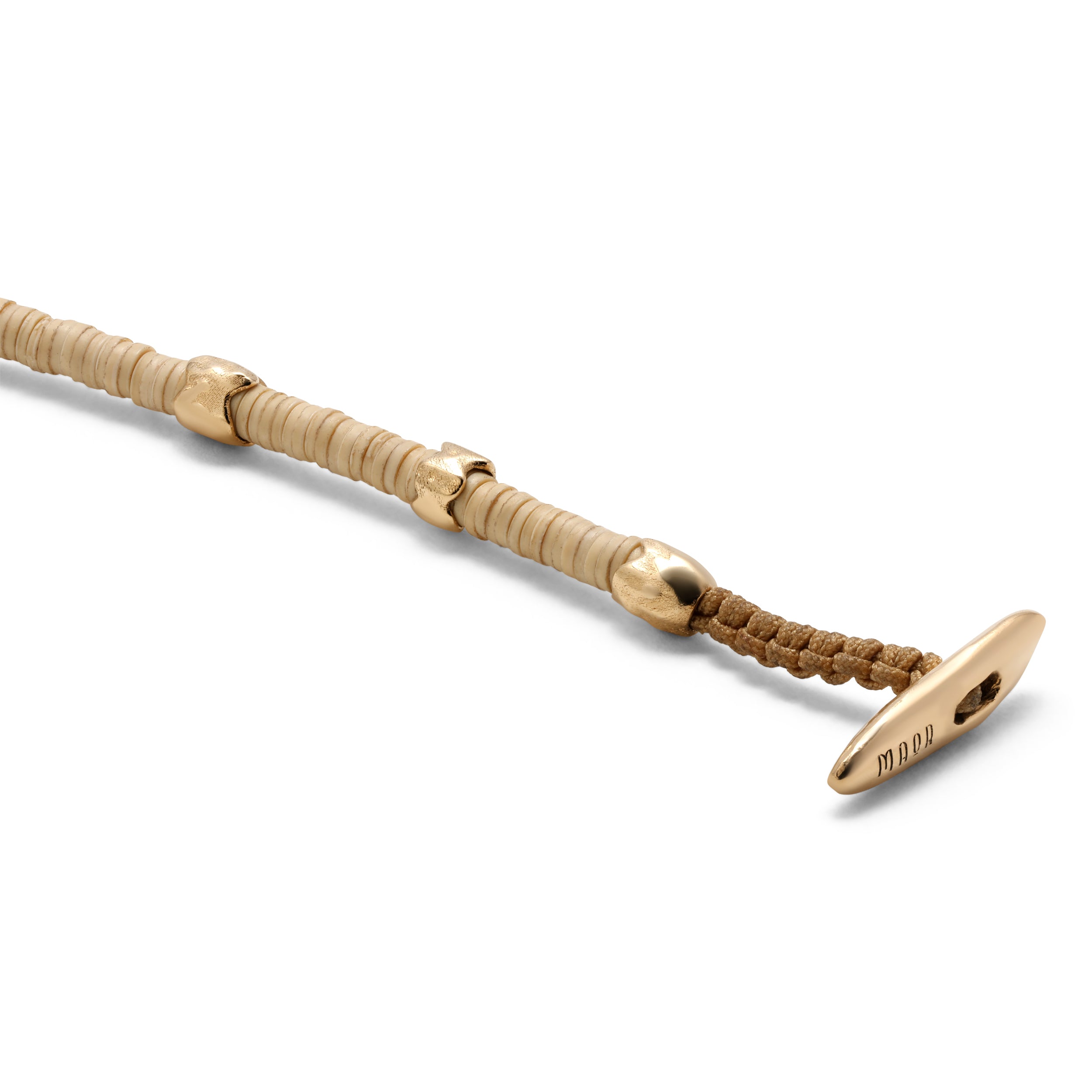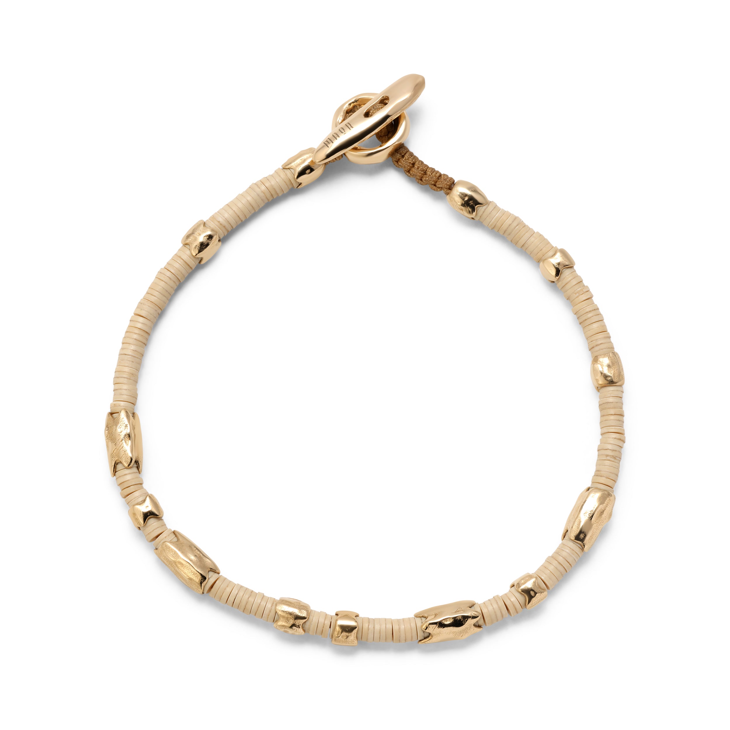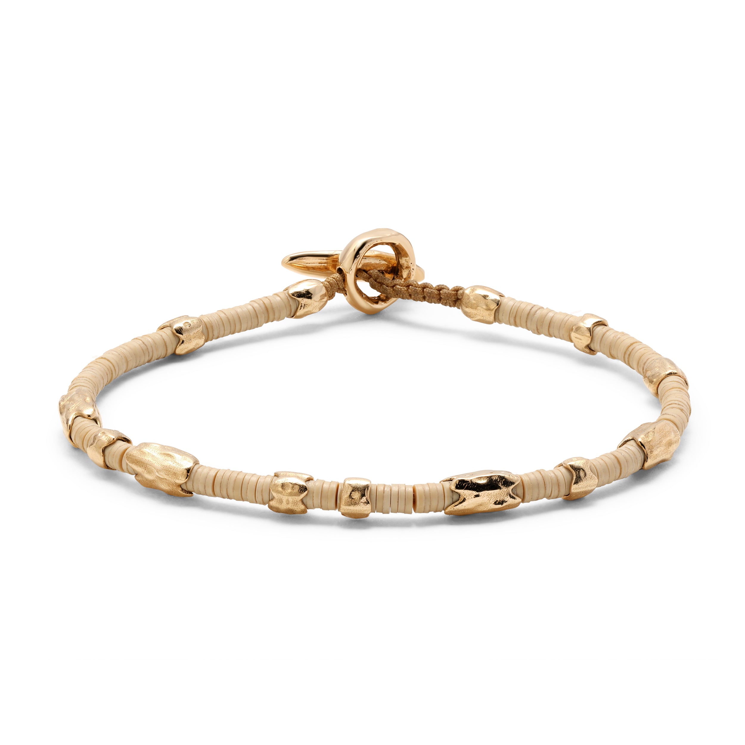 The Dryp Bracelet features authentic African vinyl beads for a unique and stylish look. Crafted with 18k yellow gold accents, this bracelet adds a touch of luxury to any outfit. The neutral off white color is versatile and perfect for any occasion.