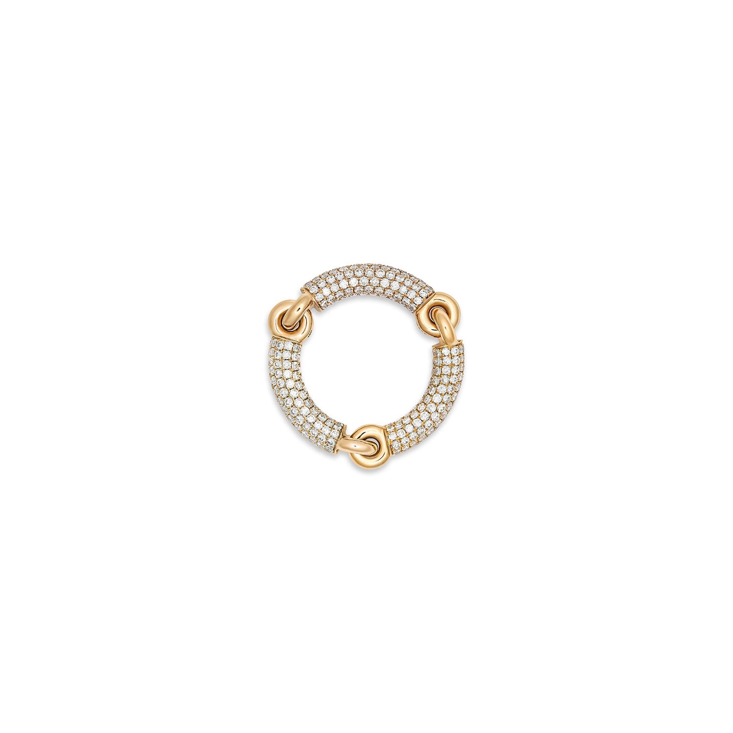 This modern yet timeless design redefines modern classic. The three solid 18k yellow gold rounded bars are enveloped entirely with honeycomb pave white diamonds. The orbital pattern allows each stone to project unprecedented brightness while making maximum direct contact with the skin.