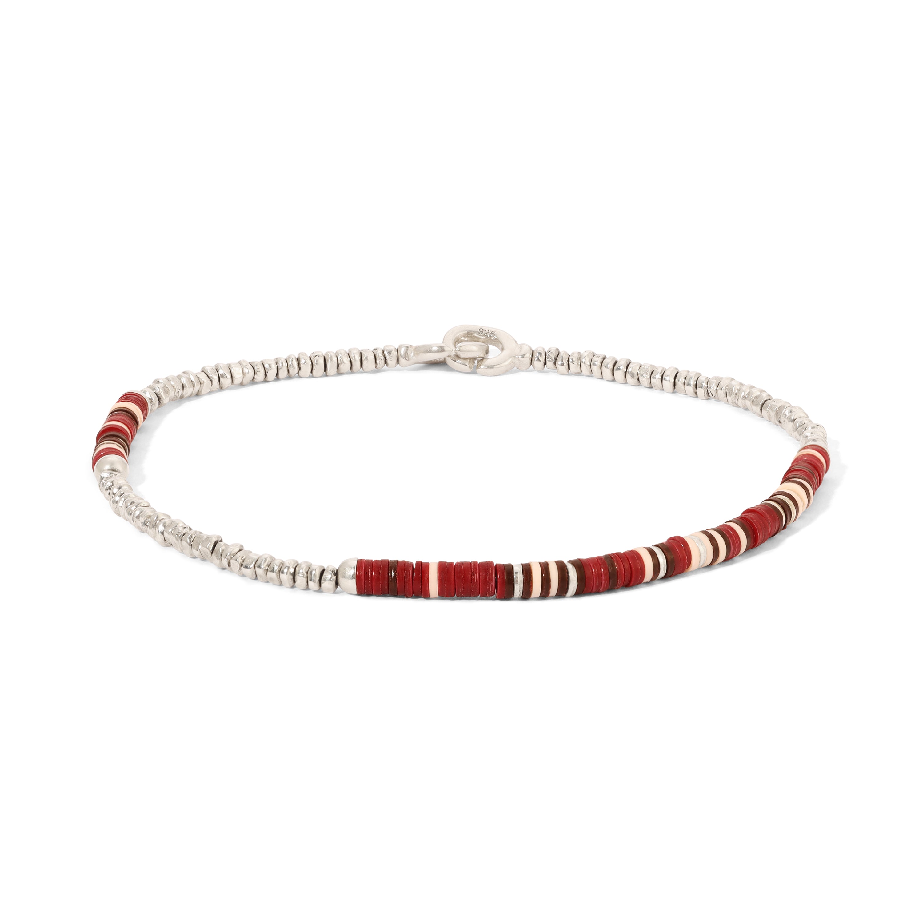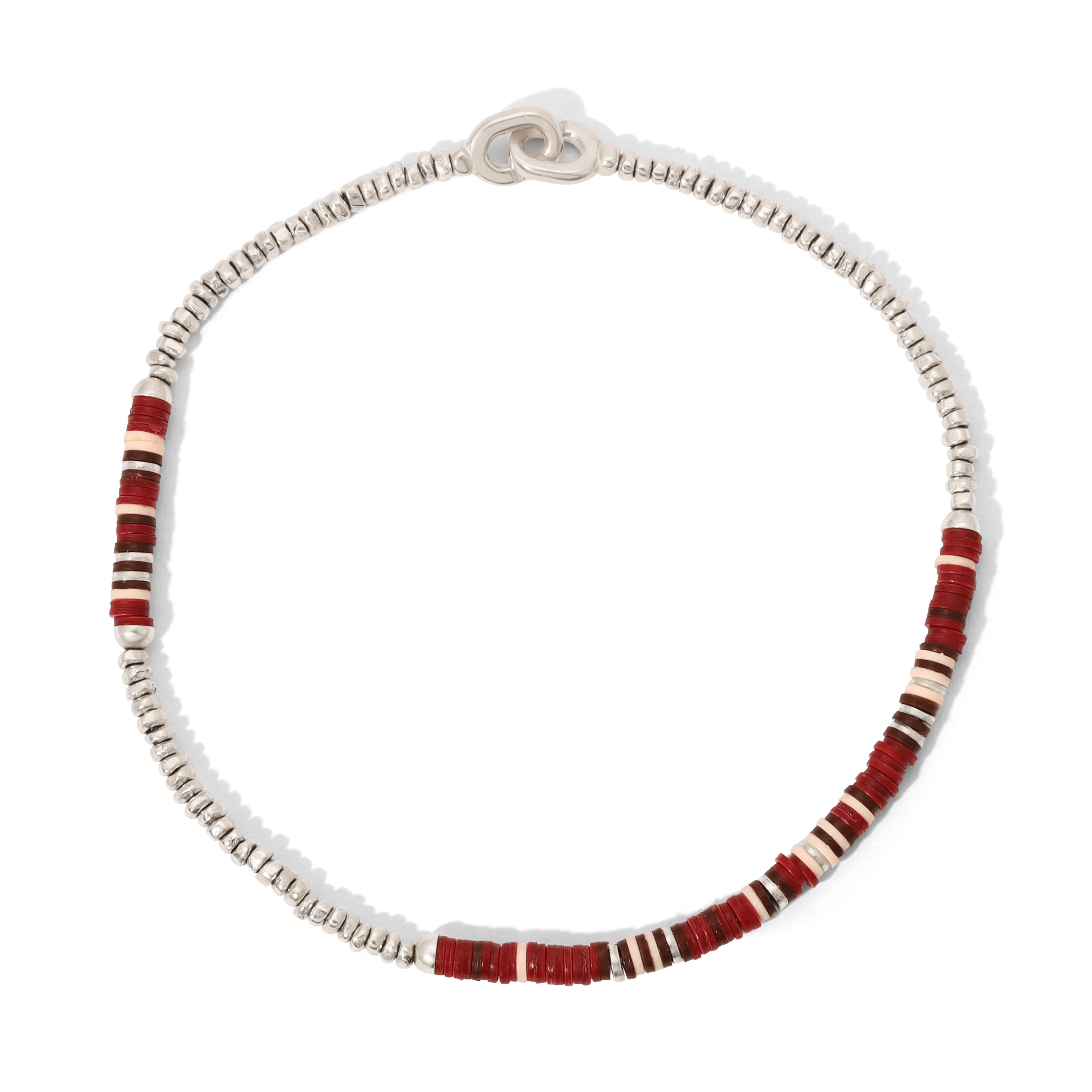 Add an elegant touch to any outfit with the Housa Bracelet. Handcrafted with sterling silver and adorned with African trade beads, this bracelet showcases a beautiful wine pattern.