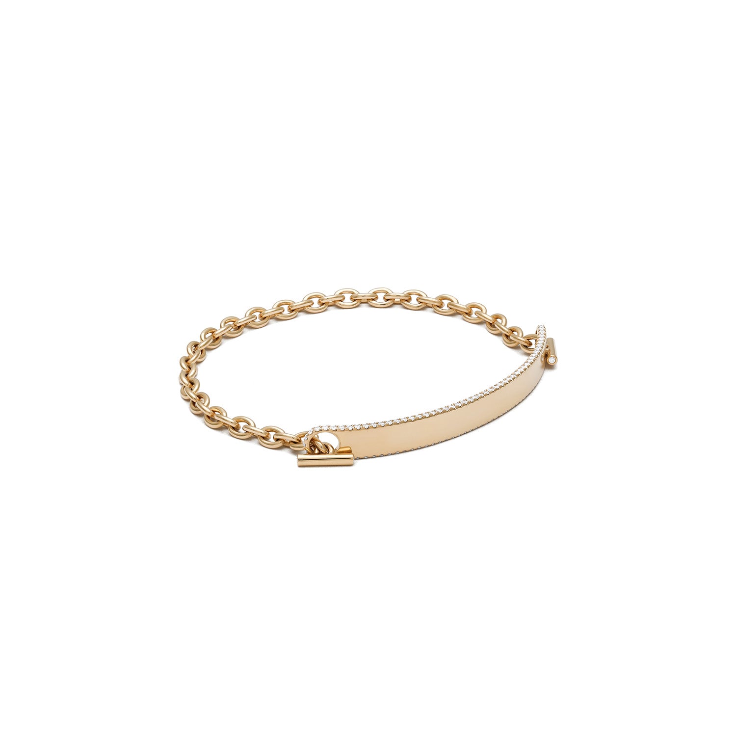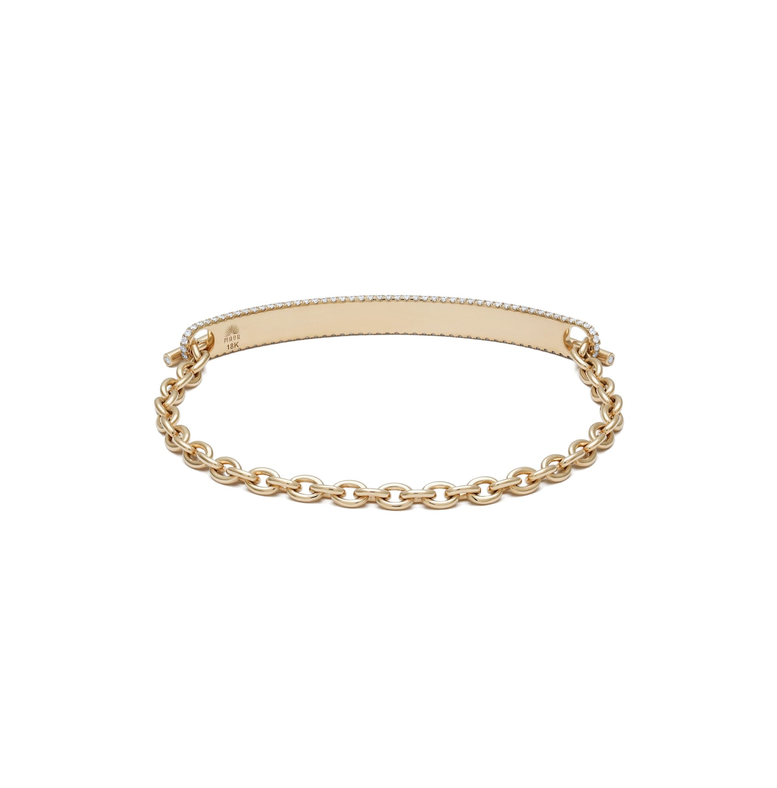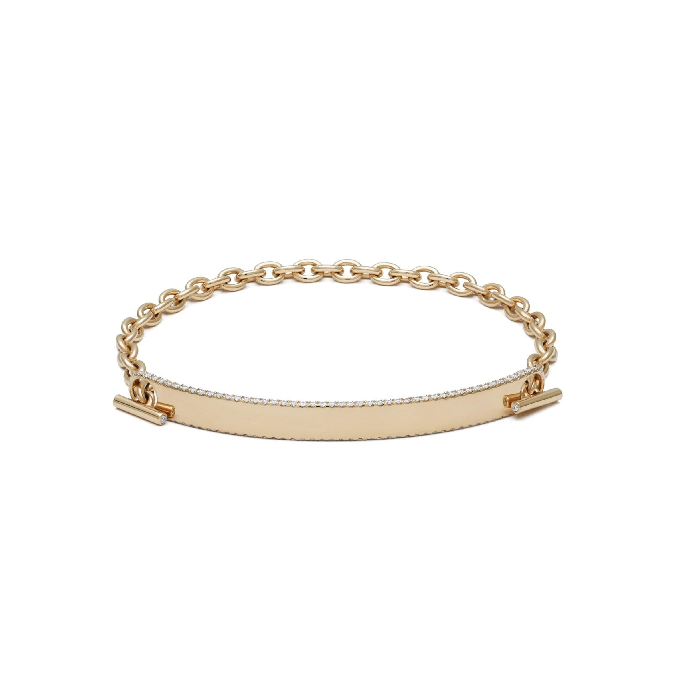 Reinventing a classic, the solid 18k yellow gold ID bracelet is expertly set with pave diamond detailing throughout. At the intersection of edge and elegance, this top seller is easily personalized with custom engraving. With the 50mm slimmer bar for women, the 5mm height is the thinnest of three choices.
