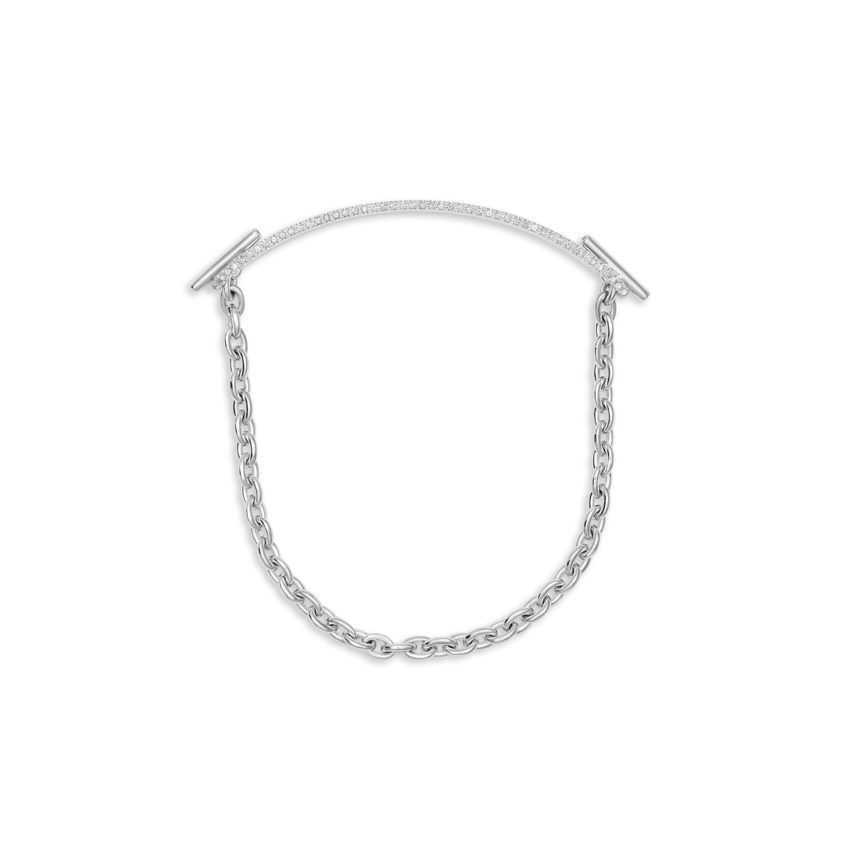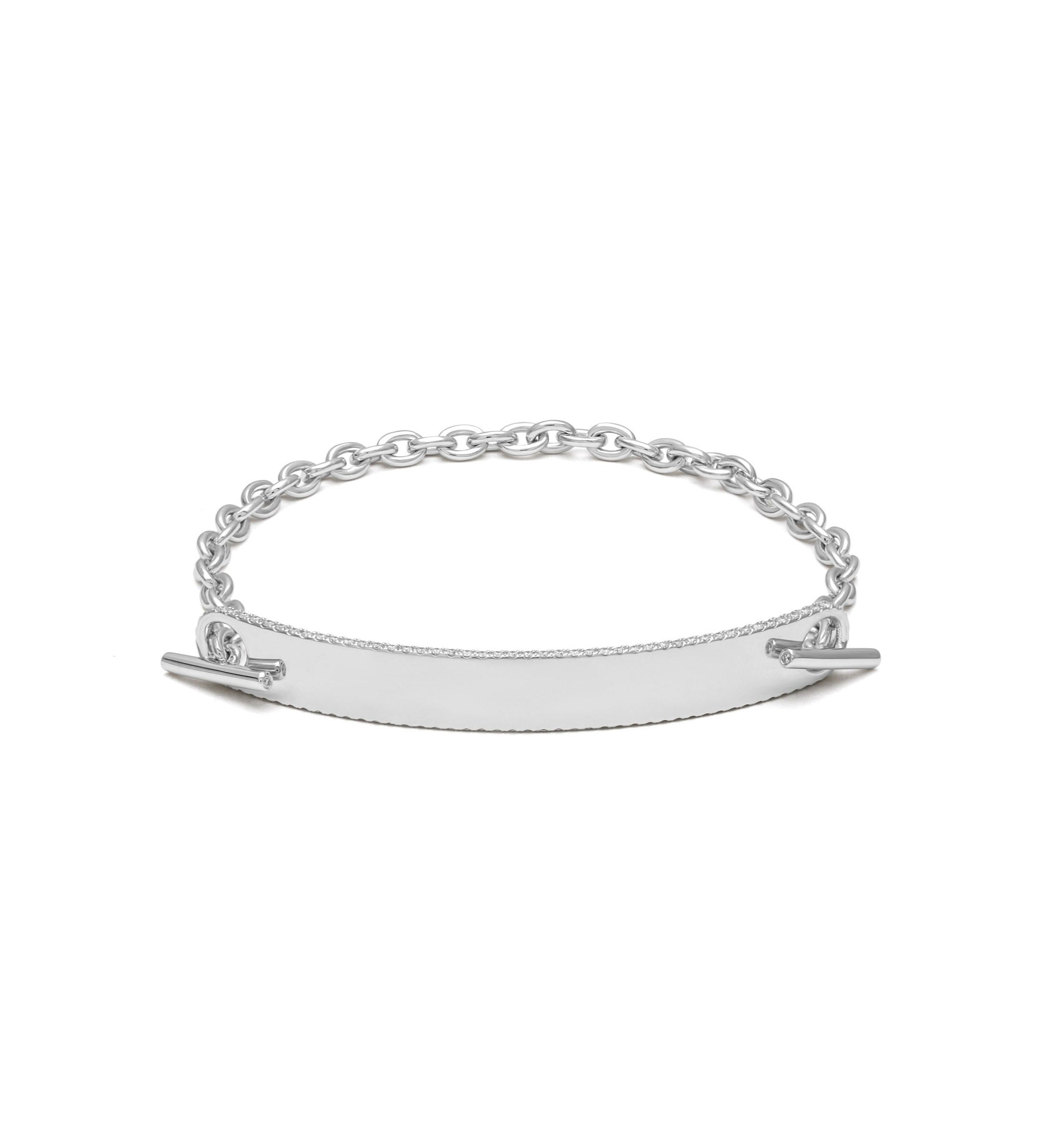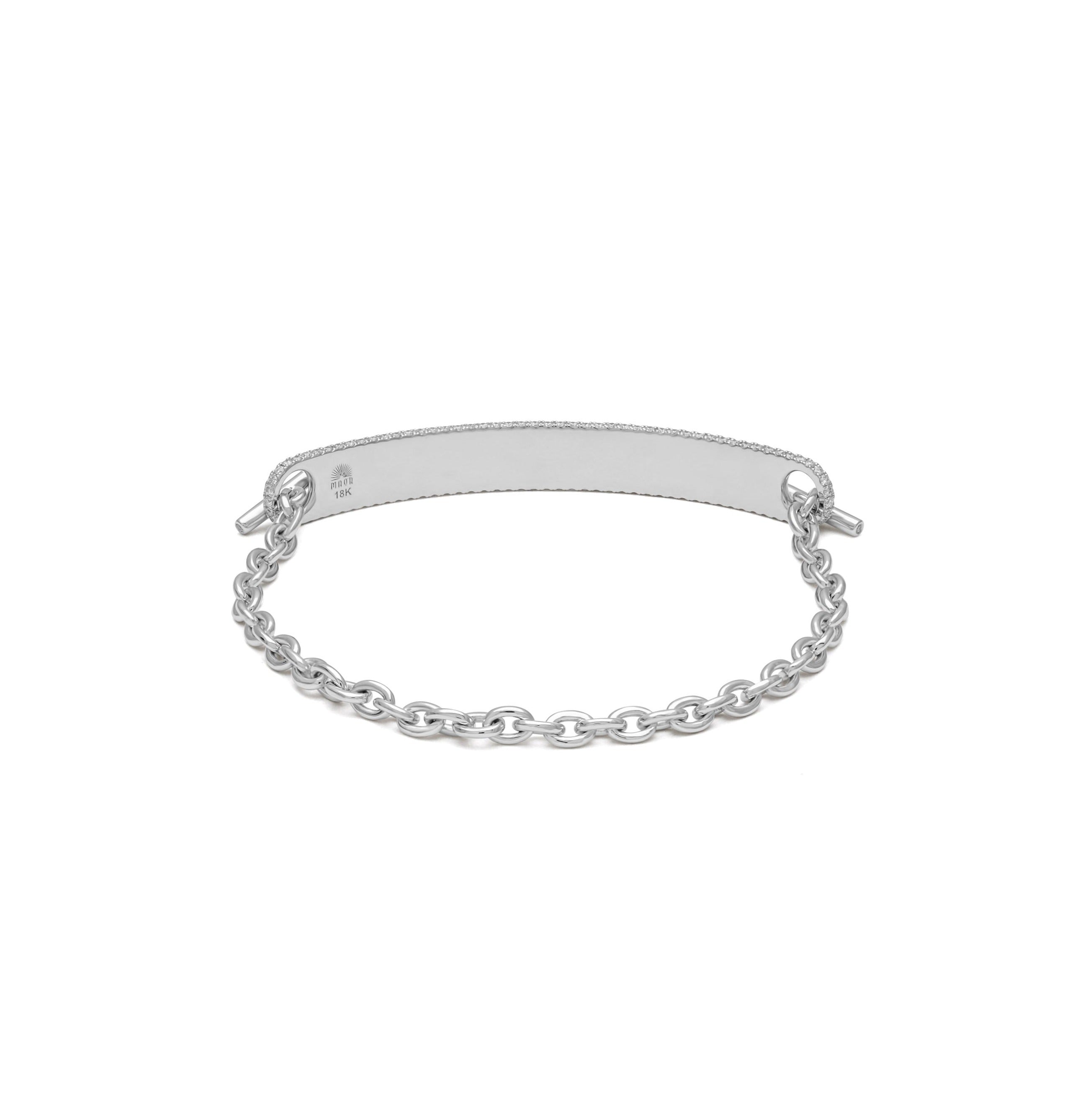 Reinventing a classic, the solid 18k white gold ID bracelet is expertly set with pave white diamond detailing throughout. At the intersection of edge and elegance, this top seller is easily personalized with custom engraving. With the 50mm slimmer bar for women, the 7mm is the midpoint of three choices.
