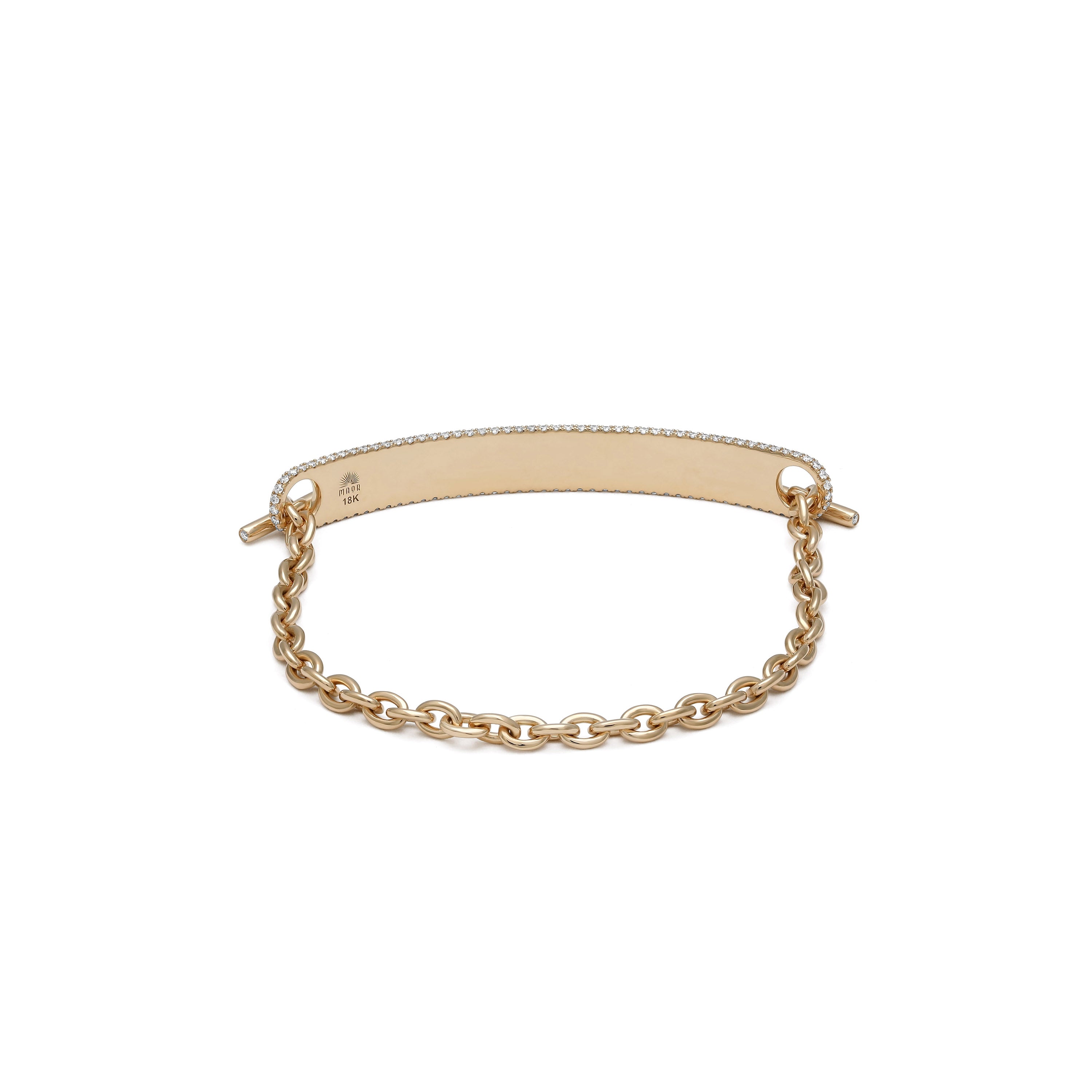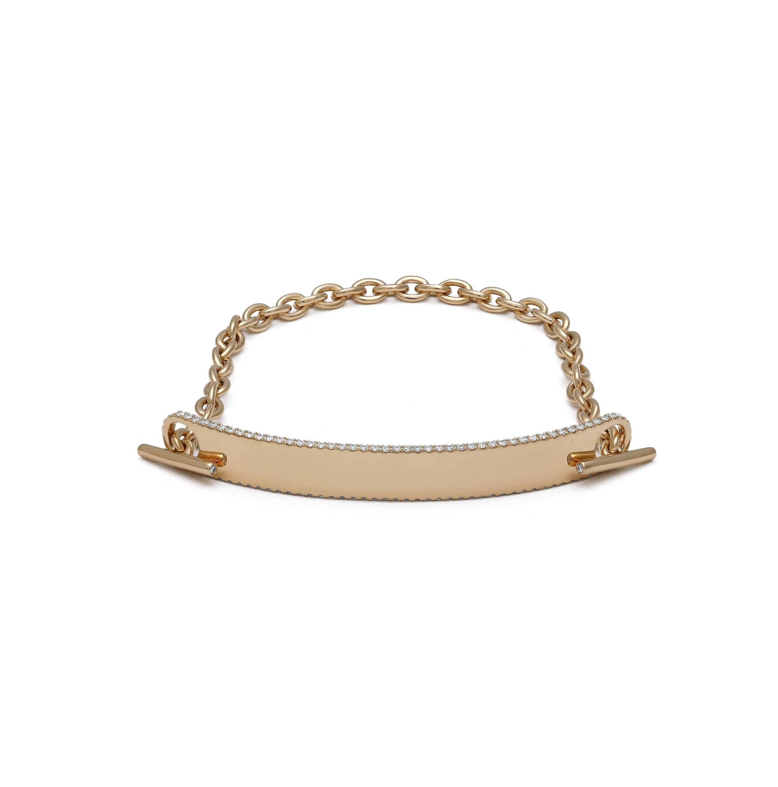 Reinventing a MAOR classic, the solid 18k yellow gold ID bracelet is expertly set with pave white diamond detailing throughout. At the intersection of edge and elegance, this top seller is easily personalized with custom engraving. With the 50mm slimmer bar for women, the 7mm is the midpoint of three choices.