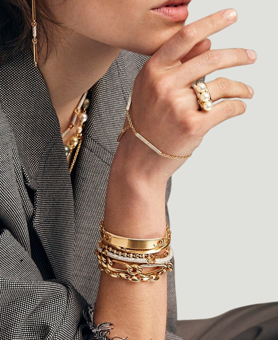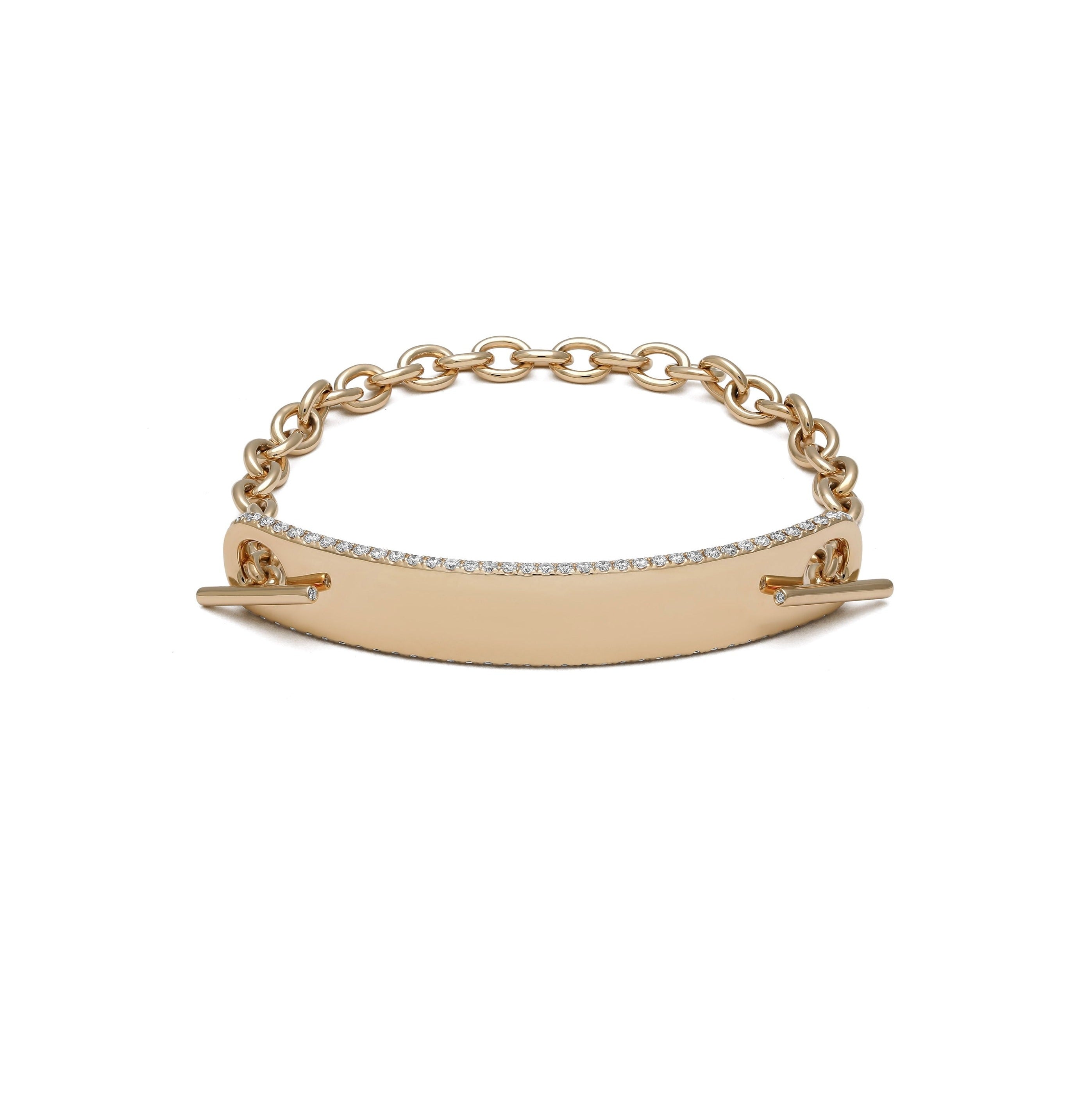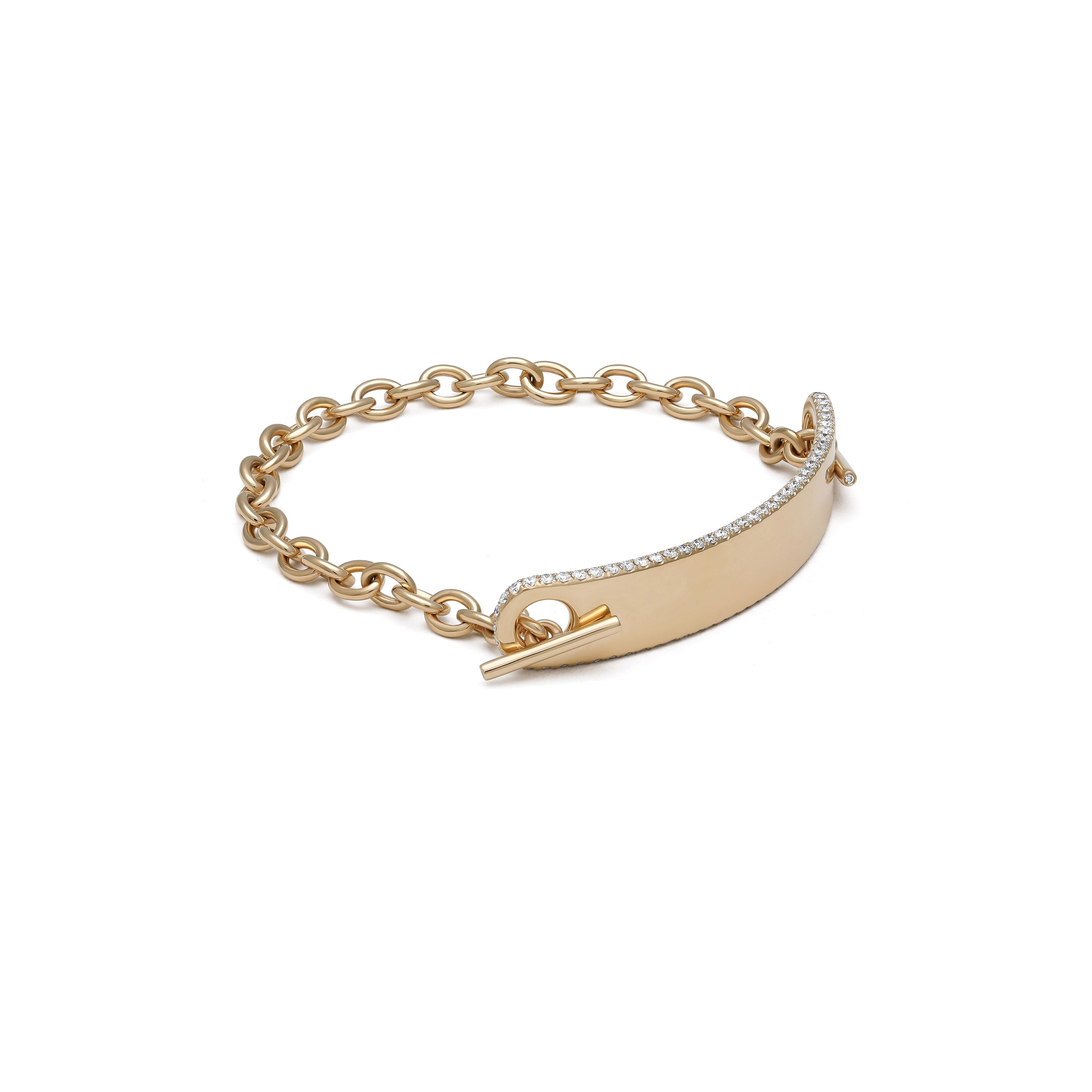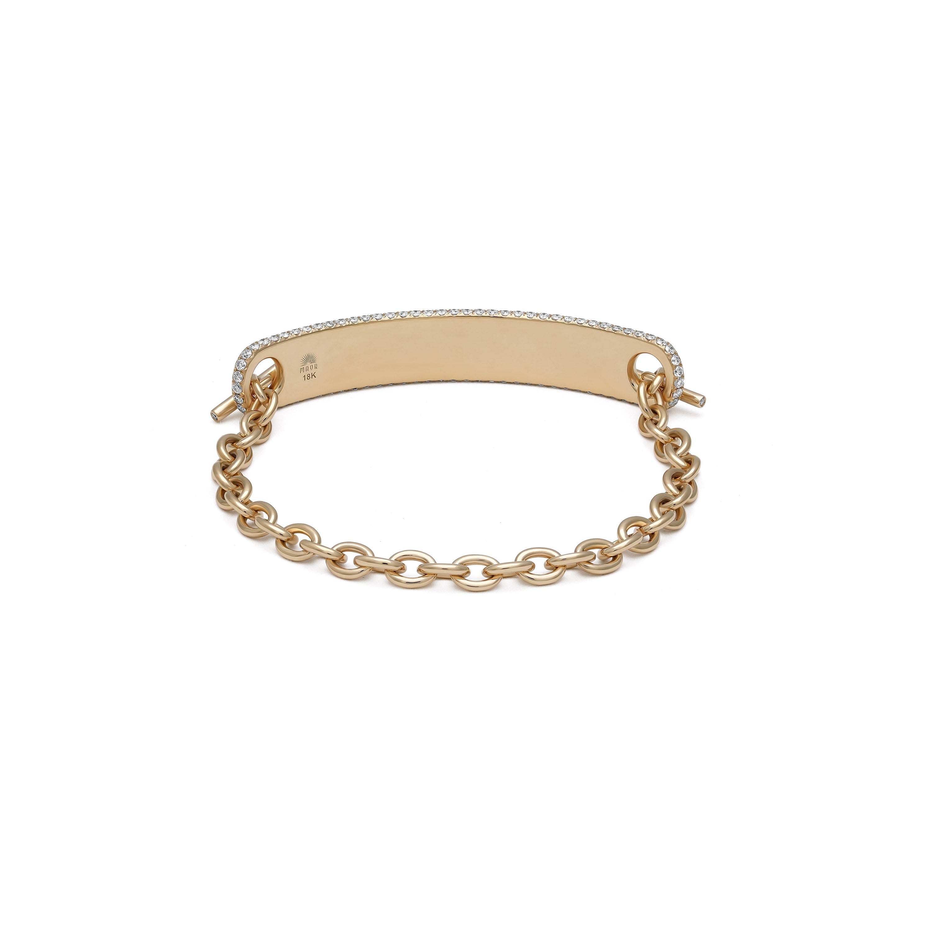 Reinventing a MAOR classic, the solid 18k yellow gold ID bracelet is expertly set with white diamond pave detailing throughout. At the intersection of edge and elegance, this top seller is easily personalized with custom engraving. With the 50mm slimmer bar for women, the 9mm is the boldest of three choices.