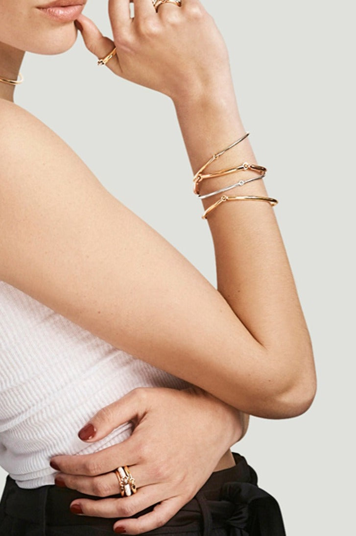Reinventing the Solstice Bracelet with a thinner design, the solid 925 sterling silver Lyra is a foundational piece for every collector. Whether worn on its own or elevating a stack, this bracelet is designed to live on the wrist as a permanently empowering force for its owner.