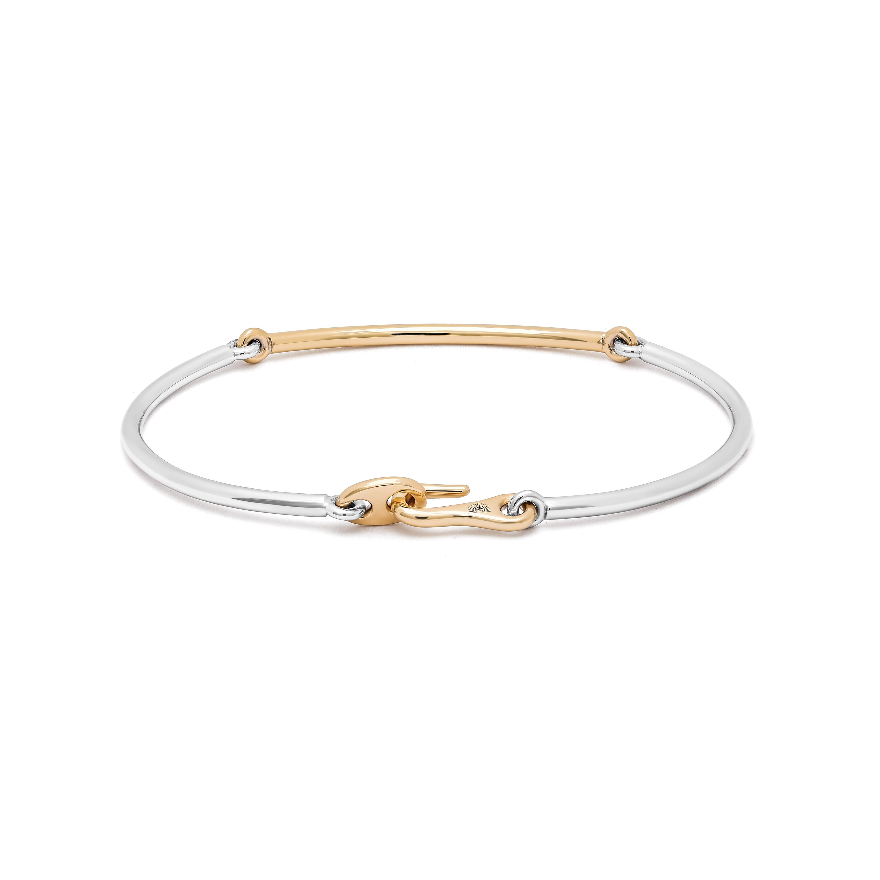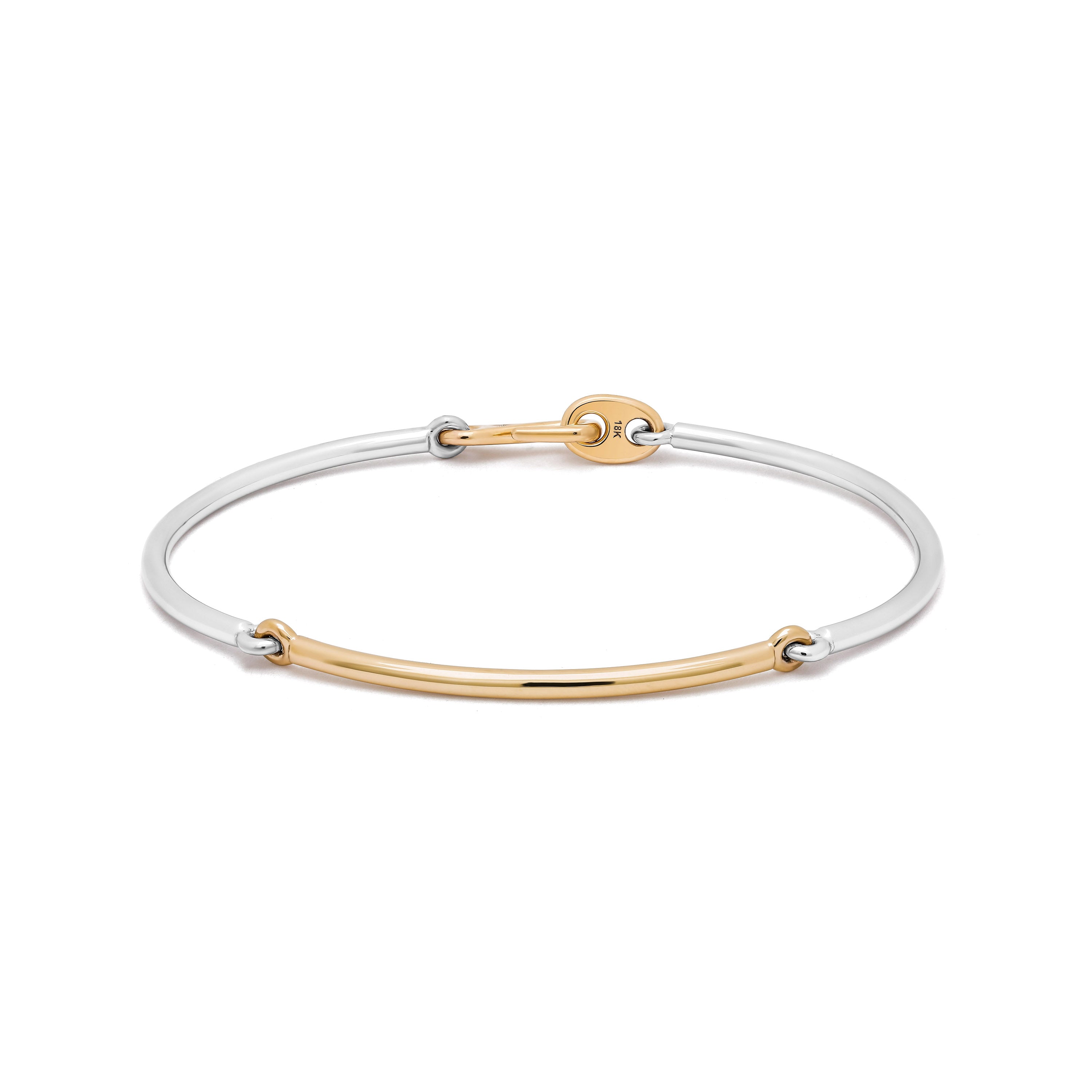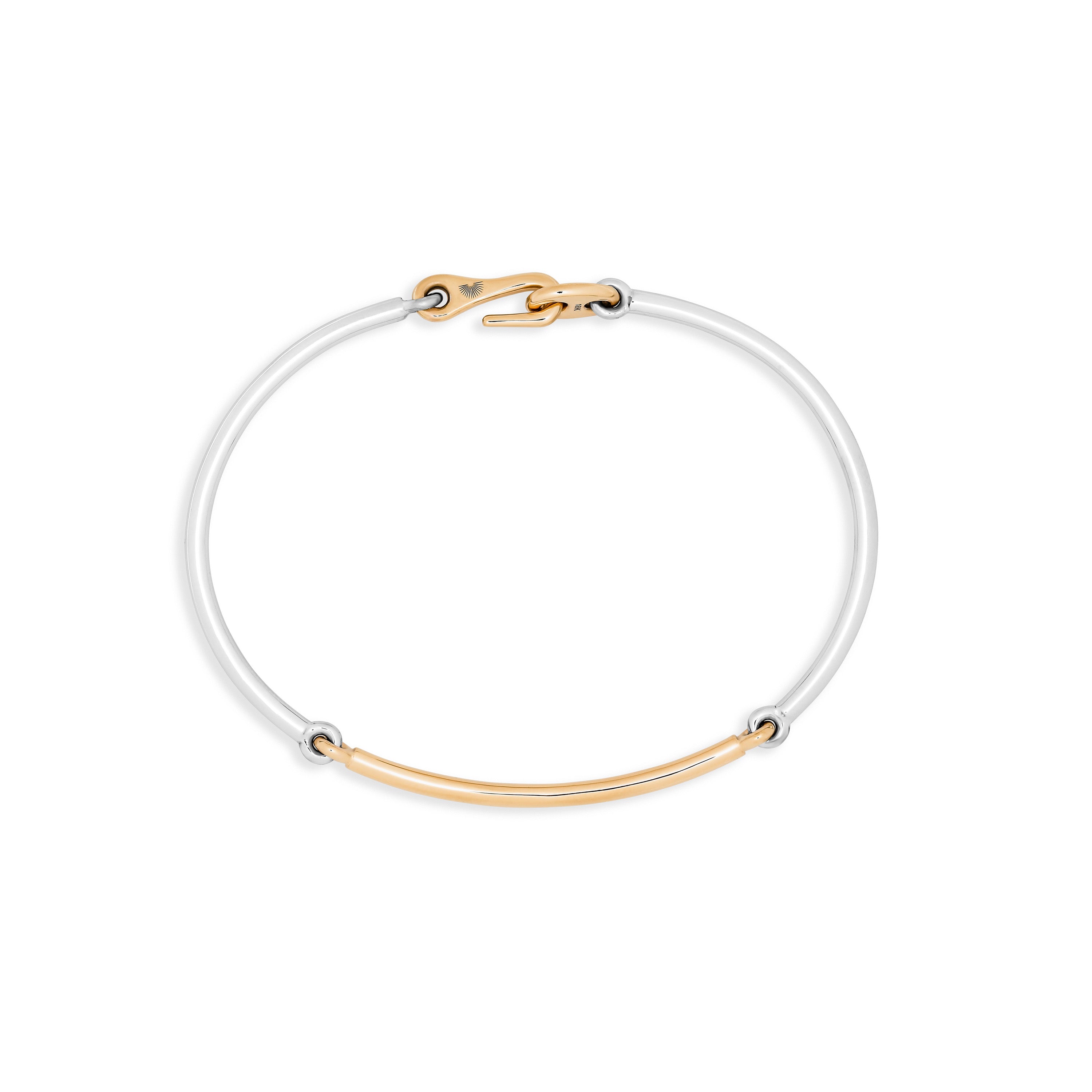 Forward-thinking yet instantly classic, the two-tone Lyra bracelet breaks the conventional mold by exploring a thinner pairing of both solid 18k yellow and white gold. Wear this Lyra as a statement piece or in a stack of complementary bracelets.