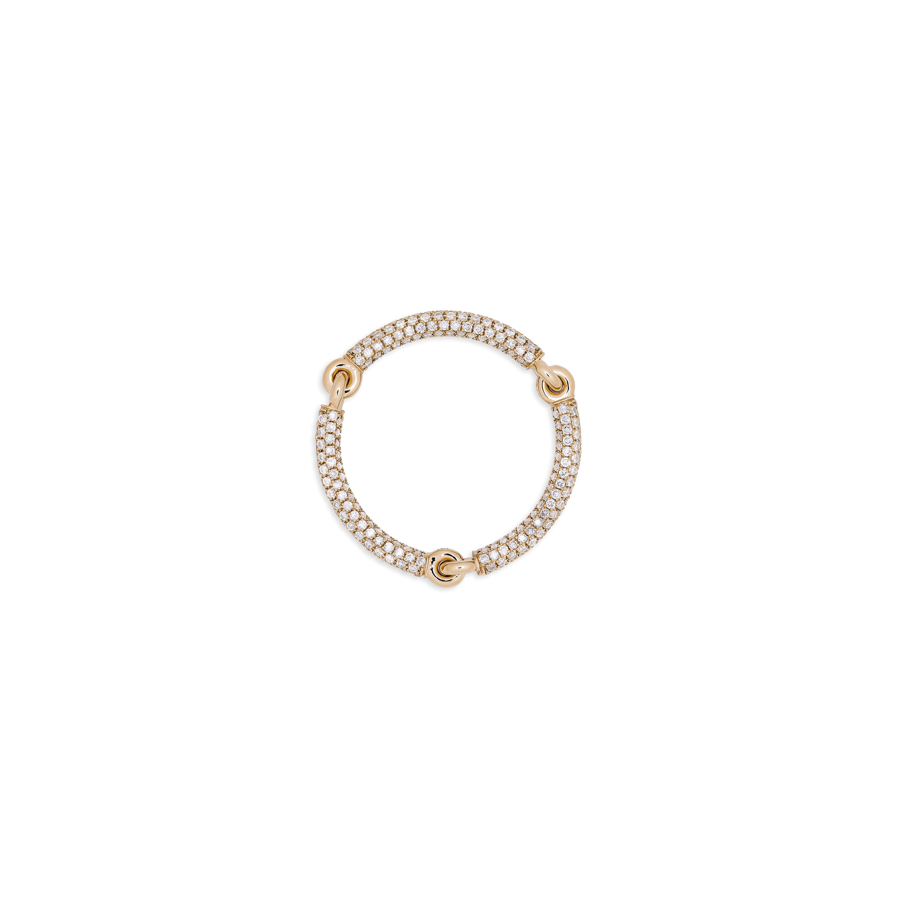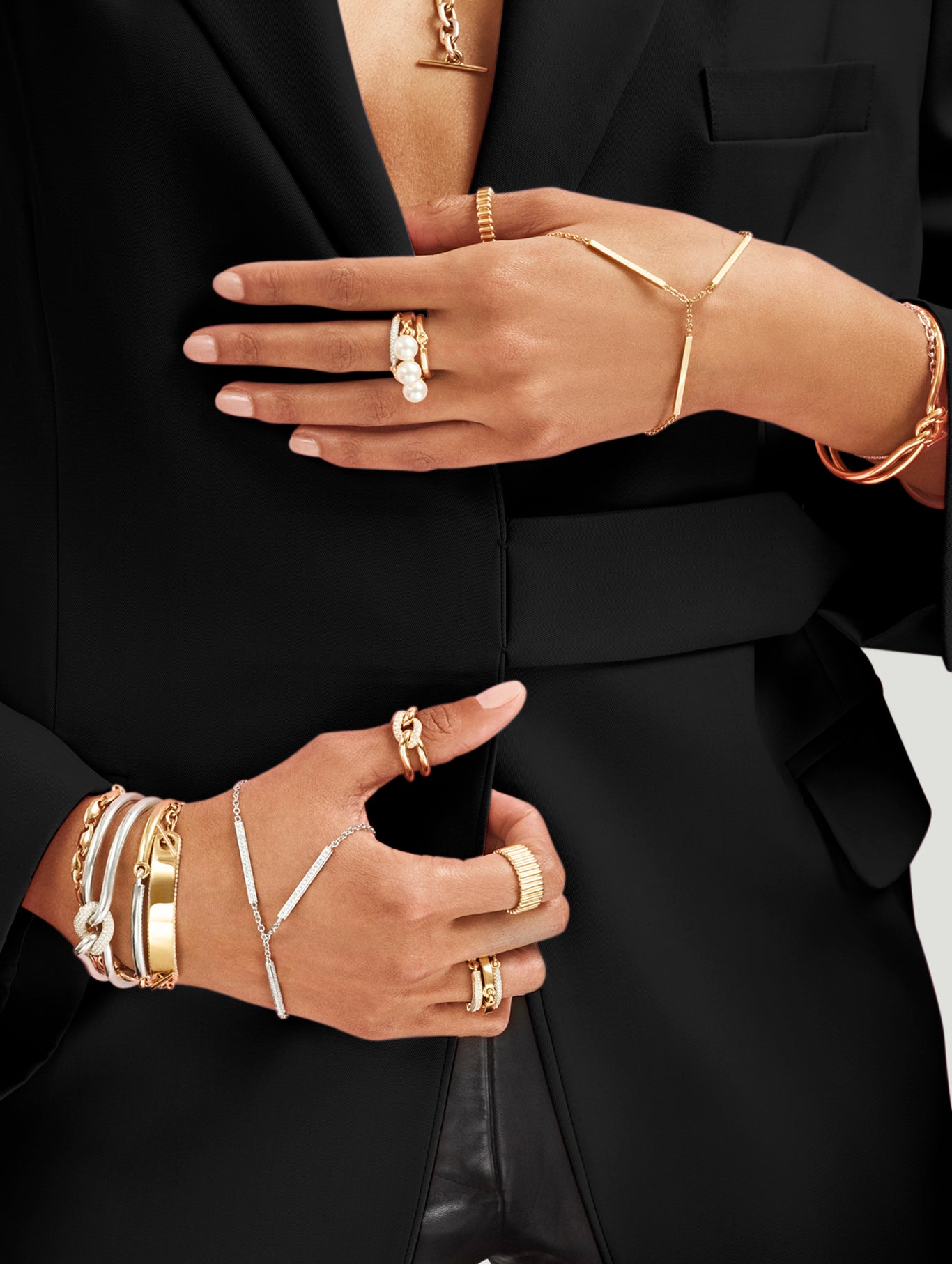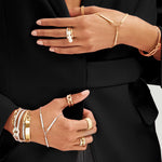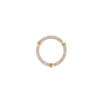 Harnessing the movement of the planets into solid 18k yellow gold with full white diamond pave, the three-part Lyra ring is a foundational piece for every collector. This ring is designed to live on the hand as a permanently empowering force for its owner. Wear alone for simplicity or together with complimentary MAOR rings.
