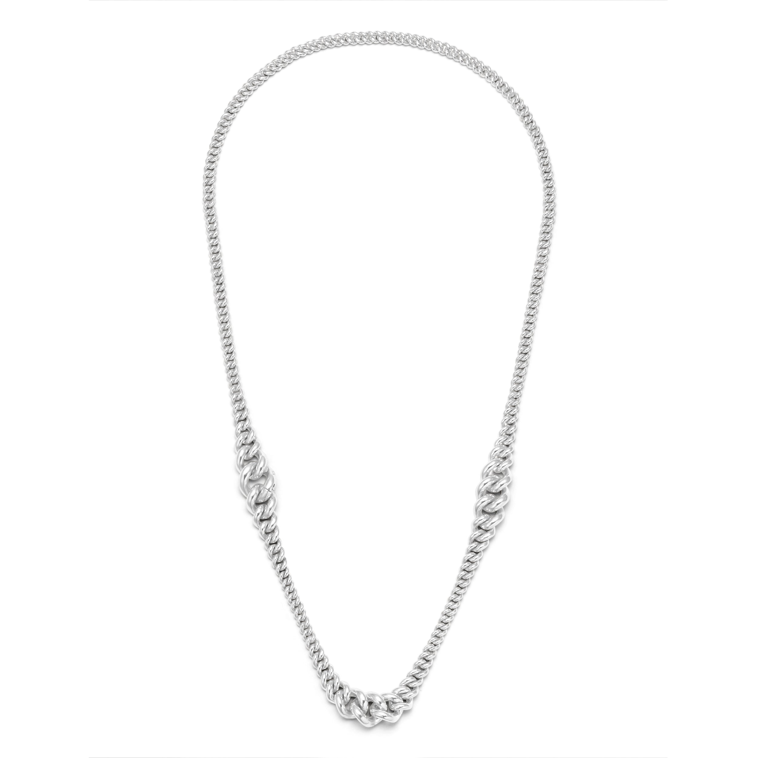 This Mic Curb Link Necklace is expertly crafted in sterling silver with three graduating sections, creating a modern and stylish design. The unique curb link adds a touch of sophistication to any outfit. Crafted with precision and quality materials, this bracelet is sure to elevate your style.