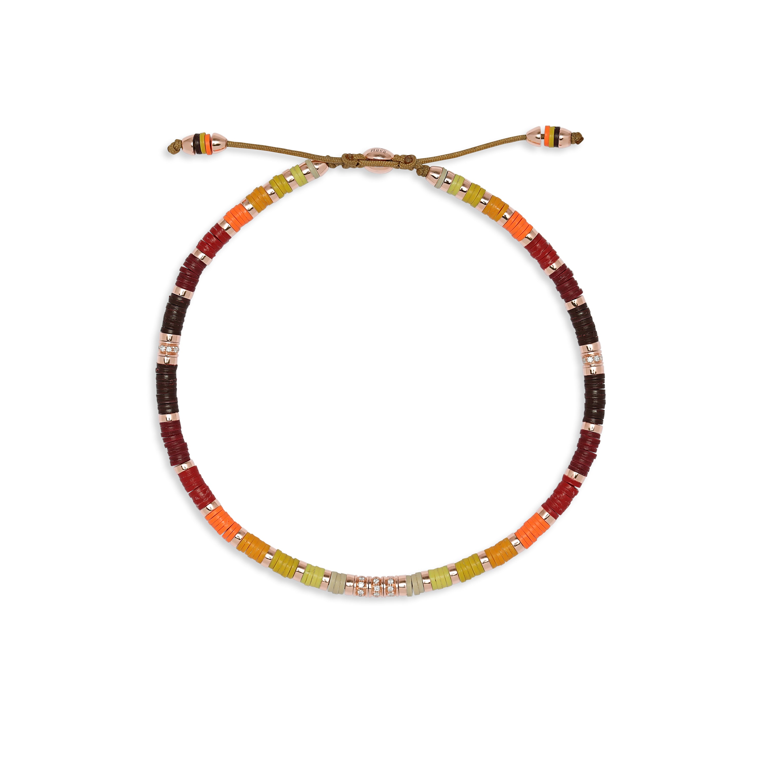 The Mini Rizon, a foundation piece that provides an addition of color to any stack, consists of 18k rose gold discs, white diamond pave detail and colorful African trade beads into a beautiful pattern. Wear paired with your favorite MAOR bracelets.