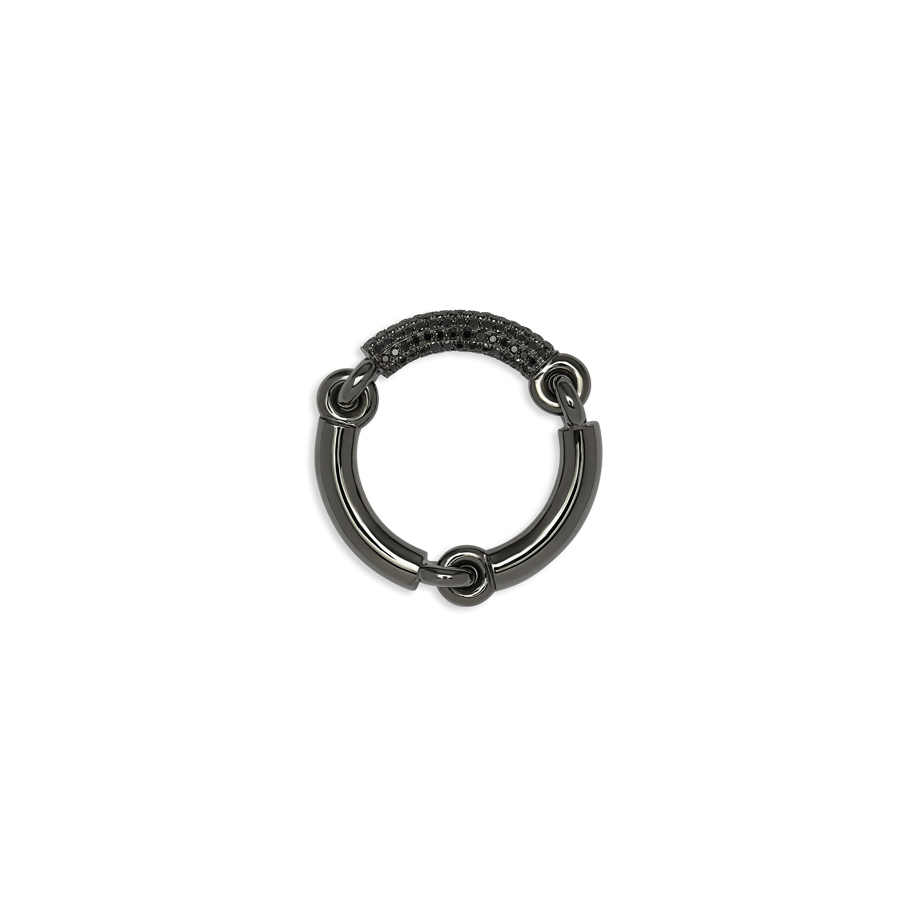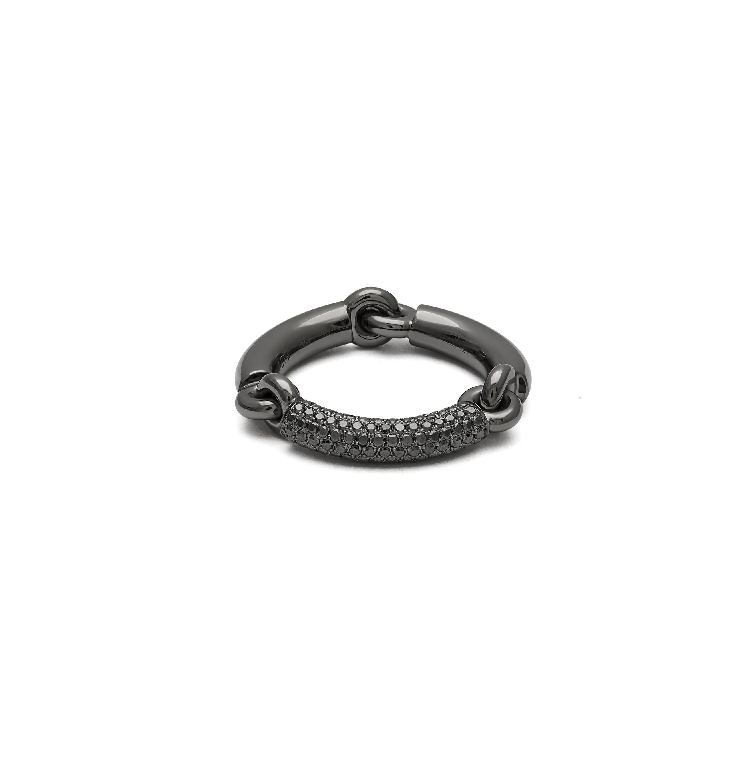 Embodying constant movement within perfect balance, the single honeycomb pave black diamond bar floats effortlessly between two links of black rhodium coated solid 18k white gold. This Solstice is expertly crafted to be worn as a solo statement piece or elevate any stack of complementary rings.