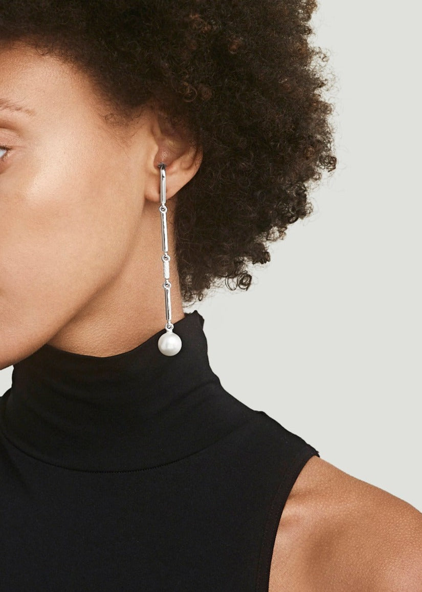 Harnessing the energy of the constellations into solid 18k white gold accented with white diamond pave and a South Sea white pearl, this Orion earring is a statement piece for the confident. Wear on its own or as a pair.