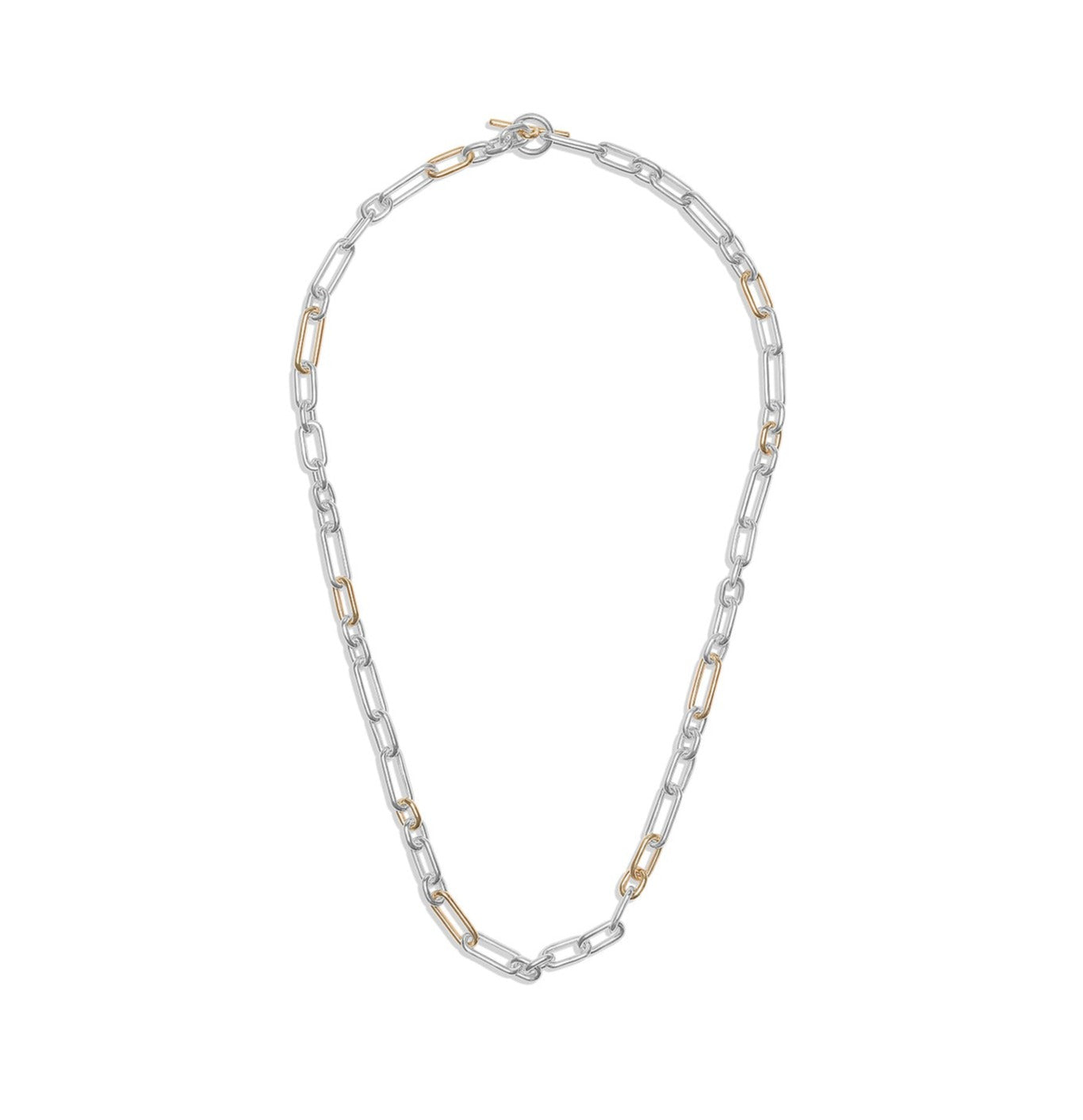Expertly crafted, the Ovalado Necklace boasts a beautiful blend of sterling silver and 18k yellow gold. This mixed metal combination exudes elegance and luxury, making it the perfect accessory for any occasion. Elevate your style and make a statement with this stunning necklace.