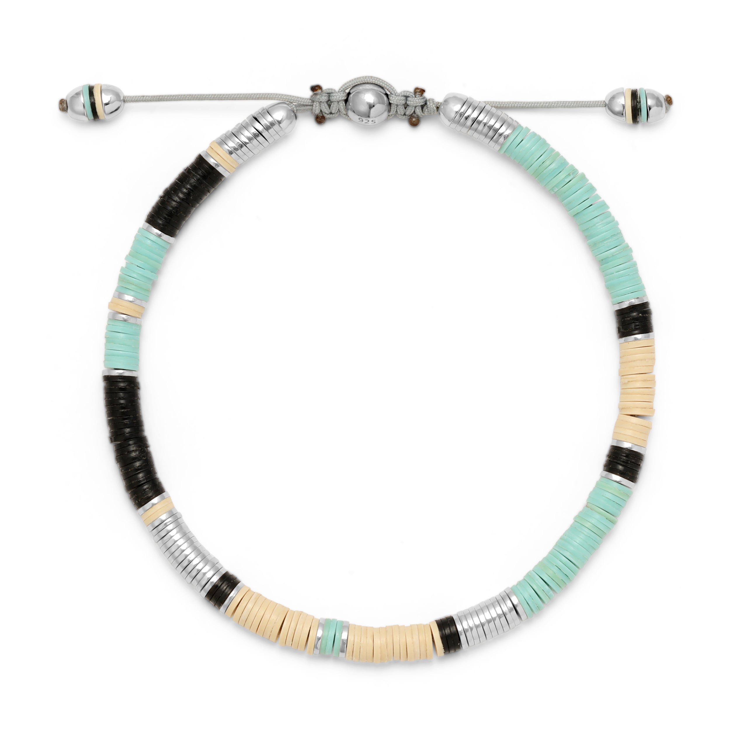 Expertly crafted from 925 sterling silver, the Palli bracelet showcases a stunning pattern of African trade beads and discs. With its light blue hues, this piece effortlessly combines style and quality for a unique and elegant accessory. Elevate any outfit with this one-of-a-kind piece.