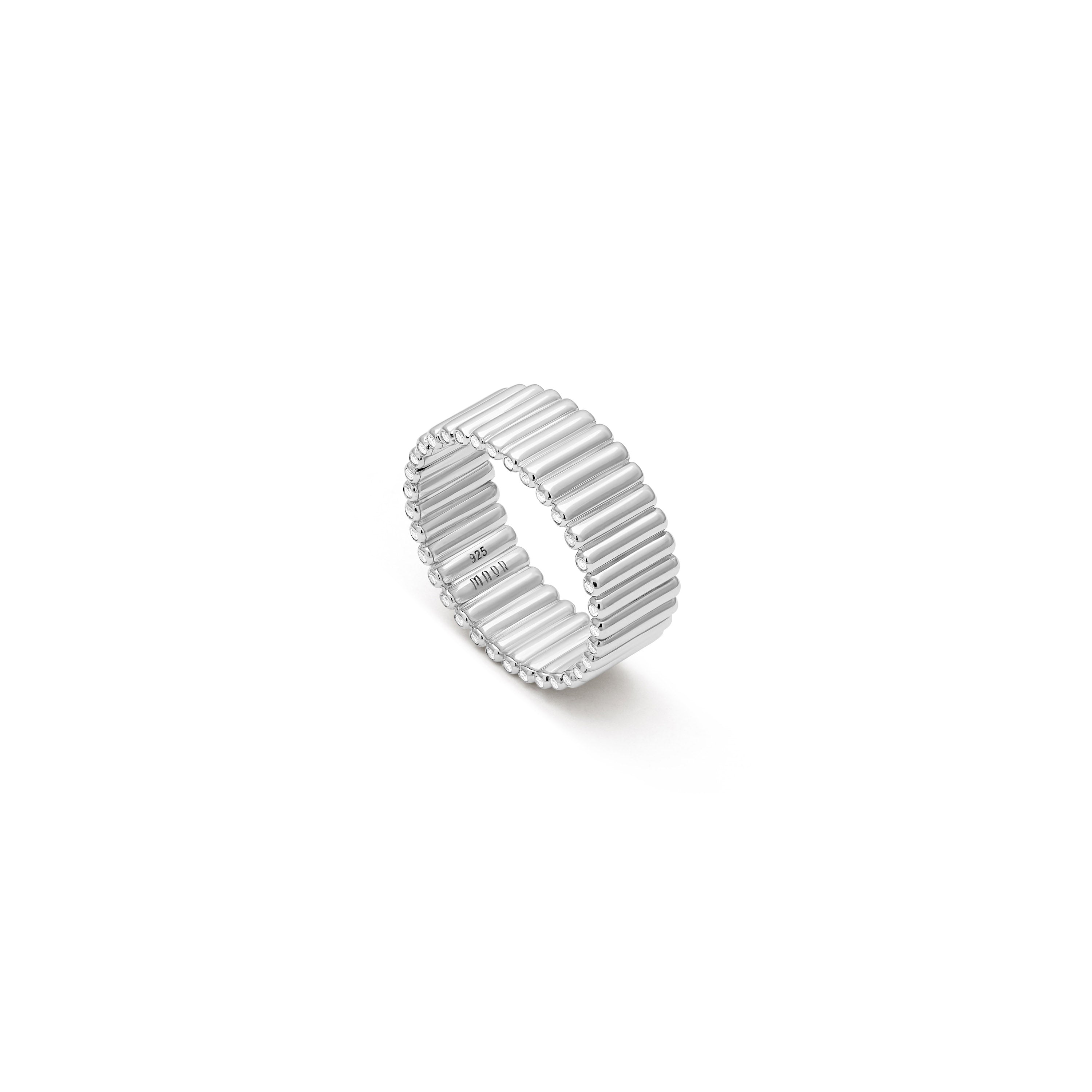With a unique texture of solid 925 sterling silver cylinders and white diamond accents, the pave tip Capsule ring is a true modern classic. Wear this piece as a stunning solo statement or in a stack of MAOR rings.
