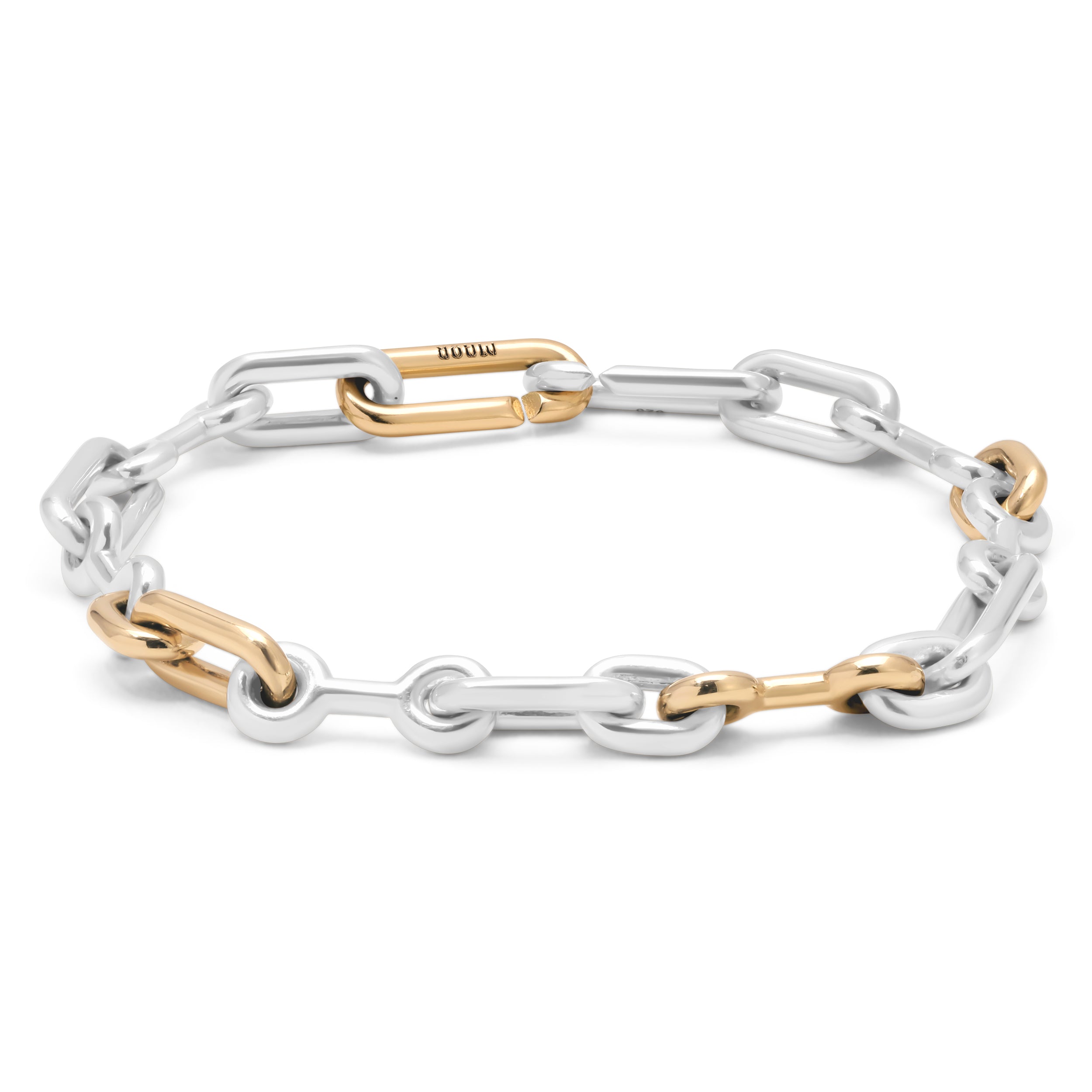The Pelham Bracelet combines 925 sterling silver with 18k yellow gold links in a solid, medium-scale design. This mixed metal piece offers a refined balance of durability and sophistication, making it an ideal accessory to enhance both casual and formal looks. Crafted for lasting quality, it effortlessly elevates your style with its timeless appeal.