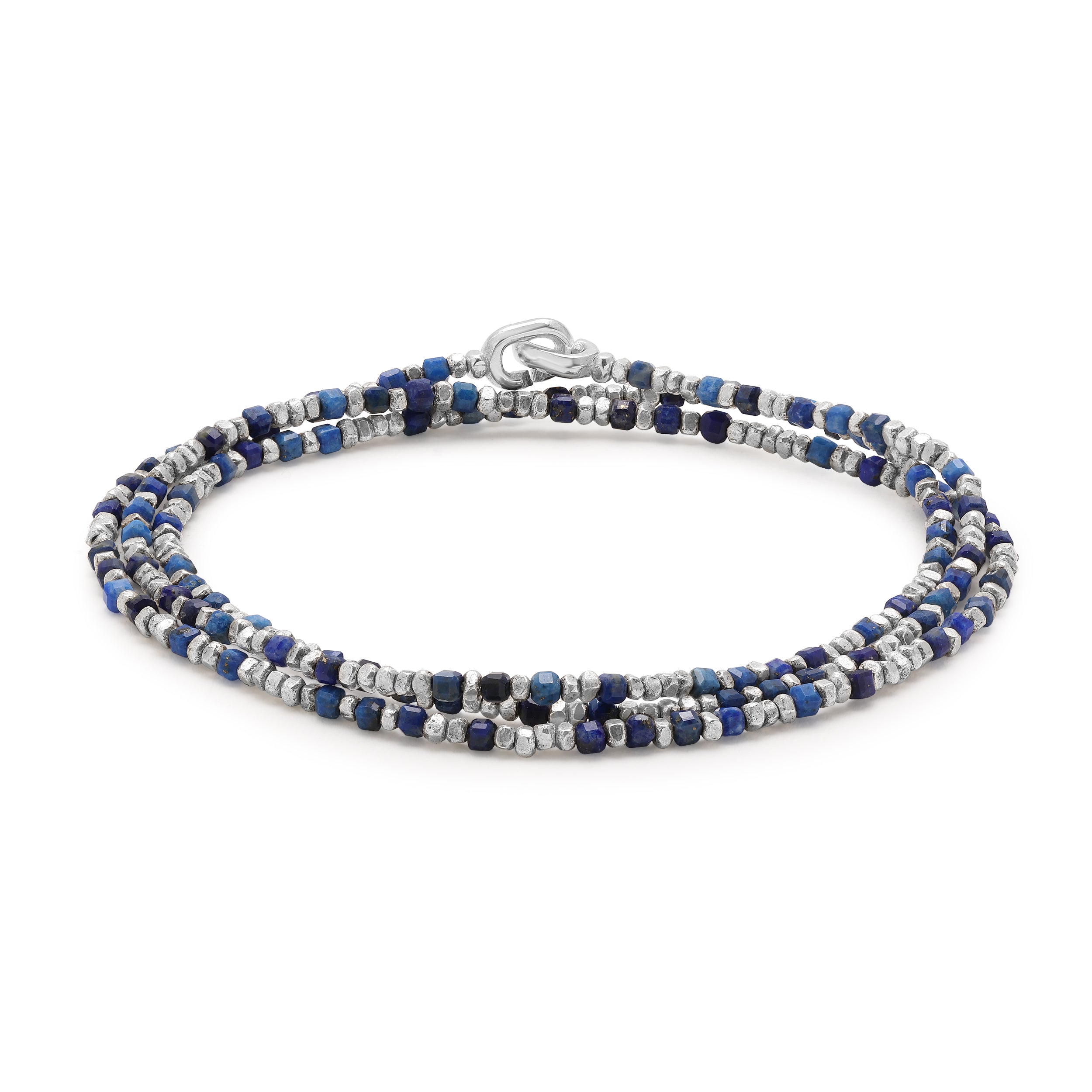 The Percep Three Wrap Bracelet features stunning sterling silver and lapis beads to add a touch of elegance to any outfit. The cornerless beads provide a comfortable fit, making this bracelet perfect for everyday wear.