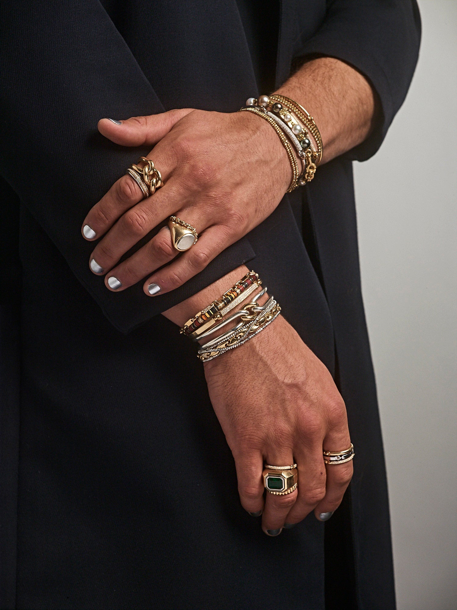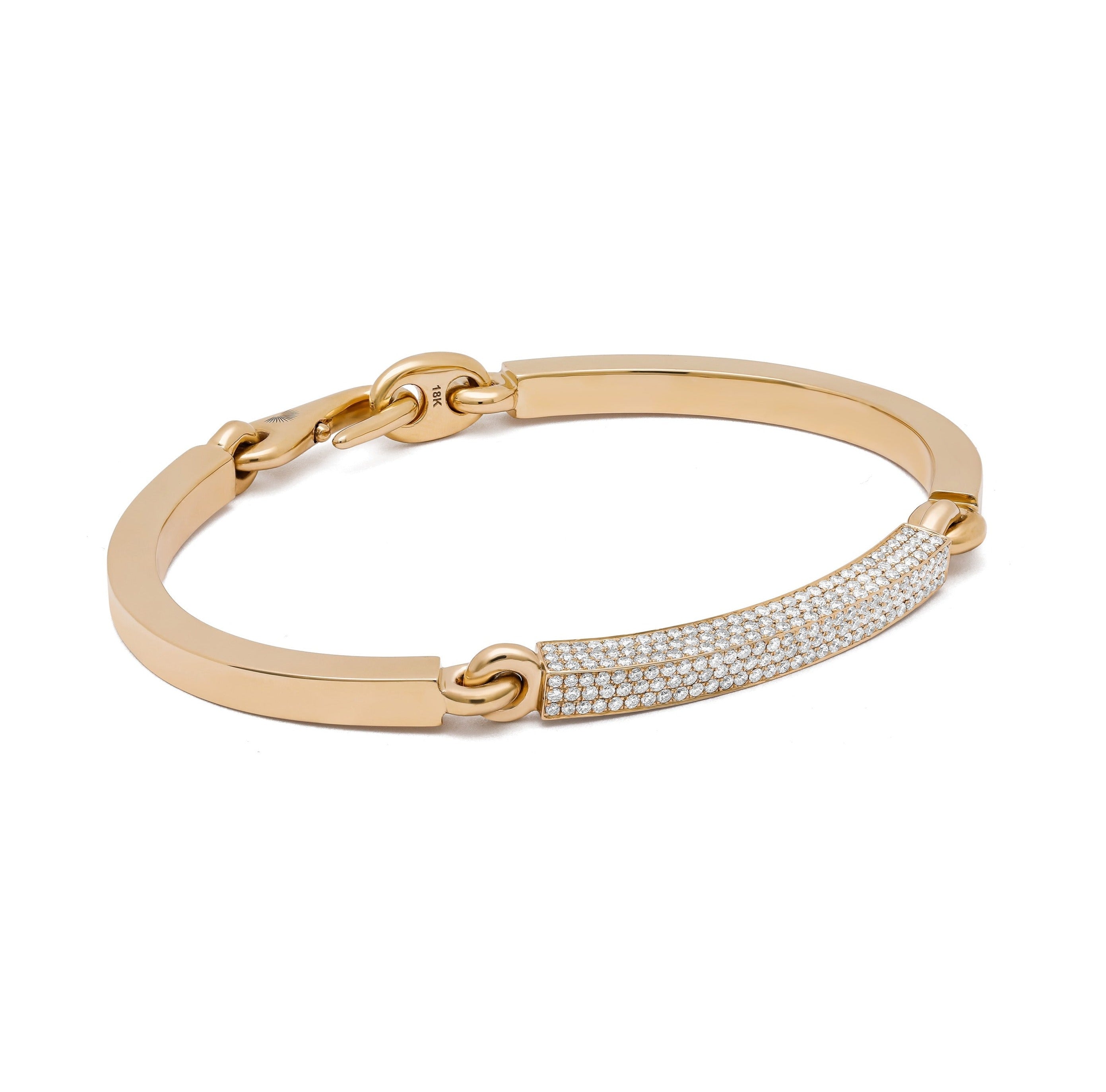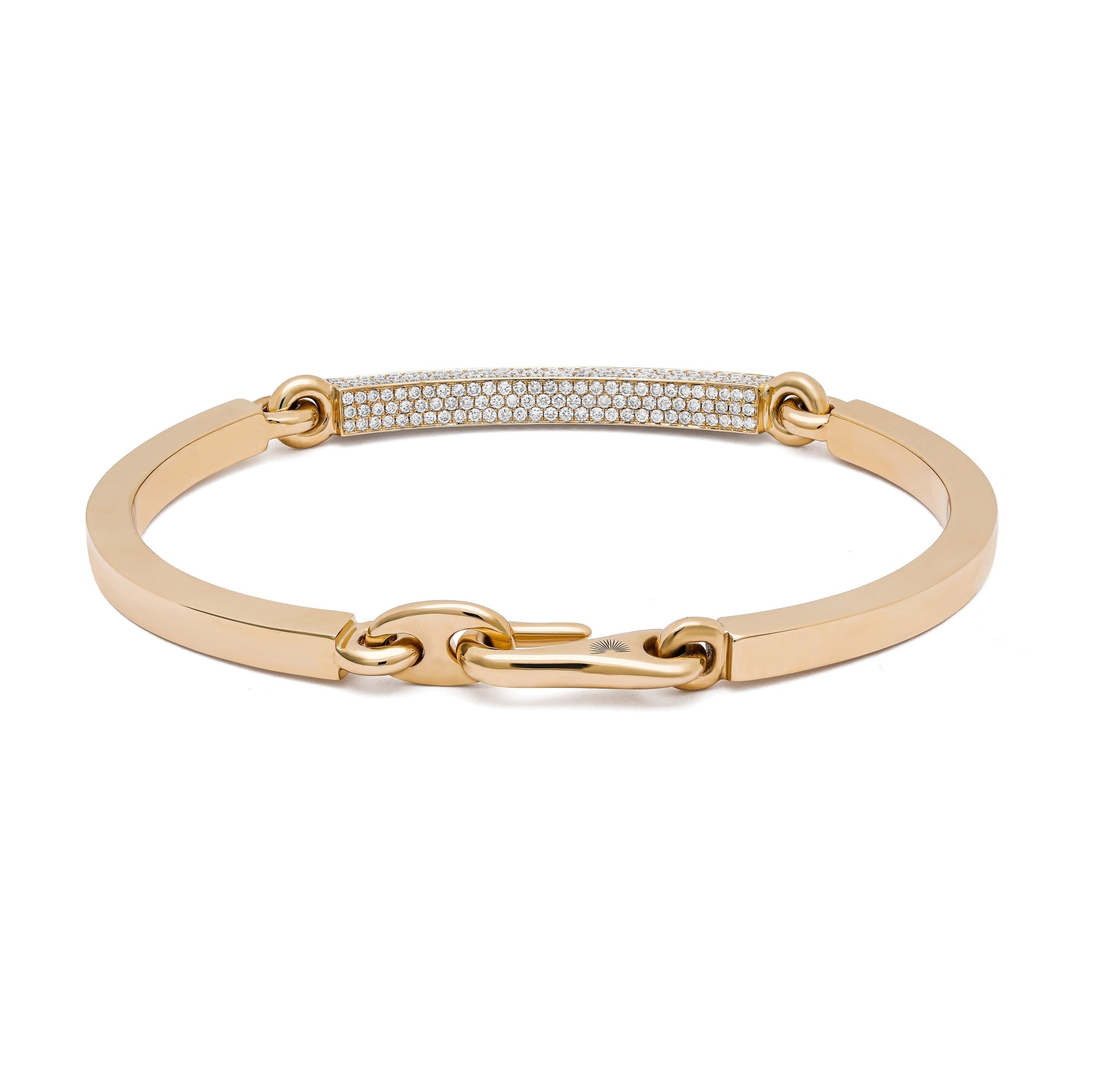 Embodying constant movement within perfect balance, the single honeycomb pave diamond bar floats effortlessly between two links of solid 18k yellow gold. With its signature square shape, this Perihelion is expertly crafted to be worn as a solo statement piece or elevate any stack of complementary bracelets.