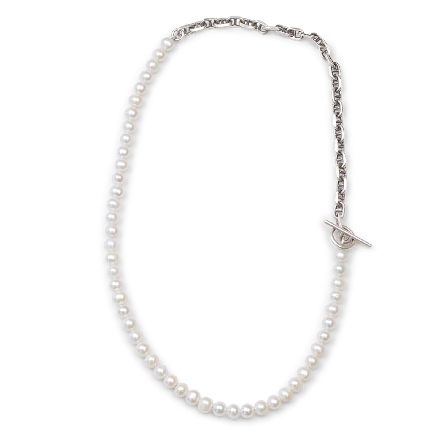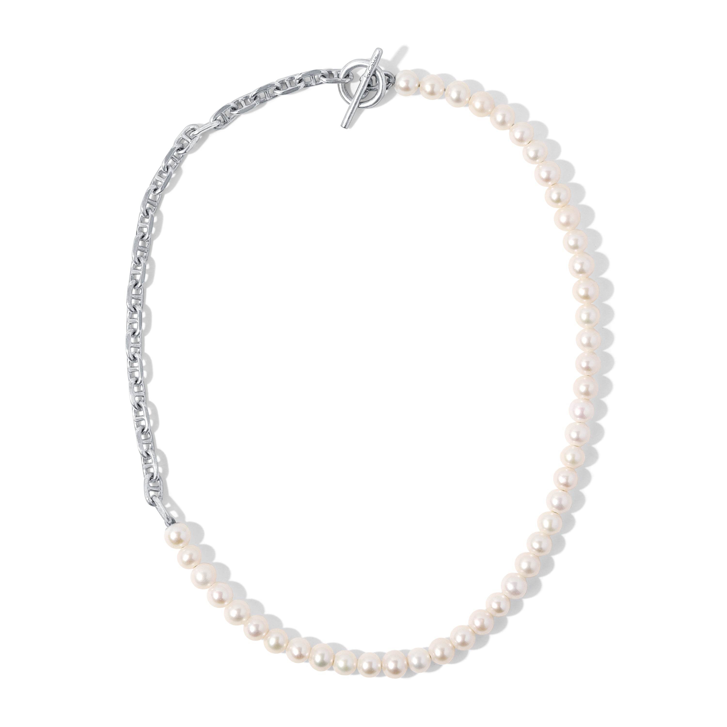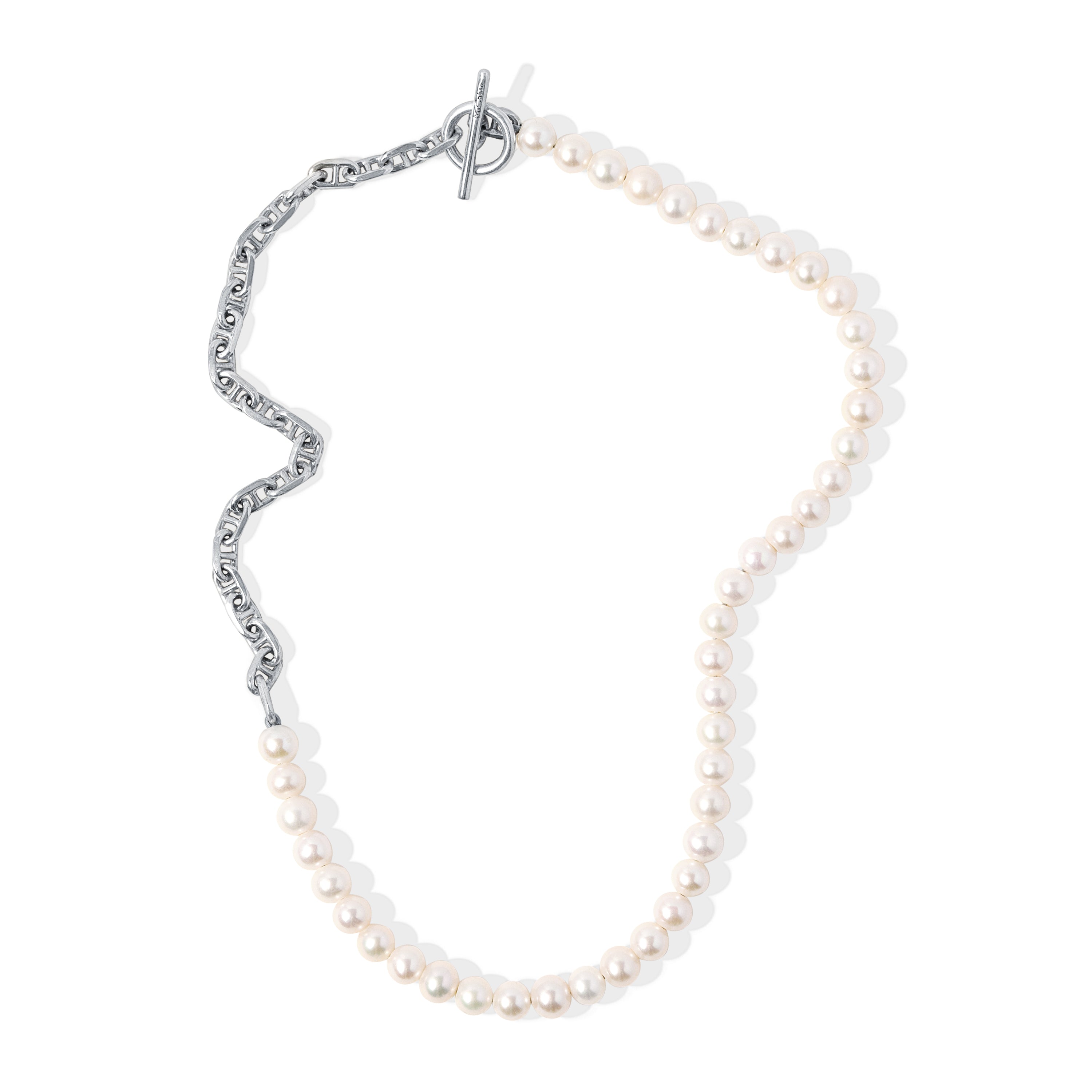 The modern fresh water white pearls necklace with an edgy addition of 925 sterling silver chain, perfect as a unisex item. We recommend the short look amongst other MAOR necklaces.