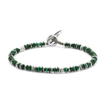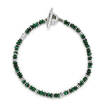 This bracelet features a mix of malachite and sterling silver beads and a patterned closure. Each bracelet reflects unique colors and patterns of the gemstone, making it a one-of-a-kind piece. Add a touch of elegance and sophistication to any outfit with the Pillon Bracelet.