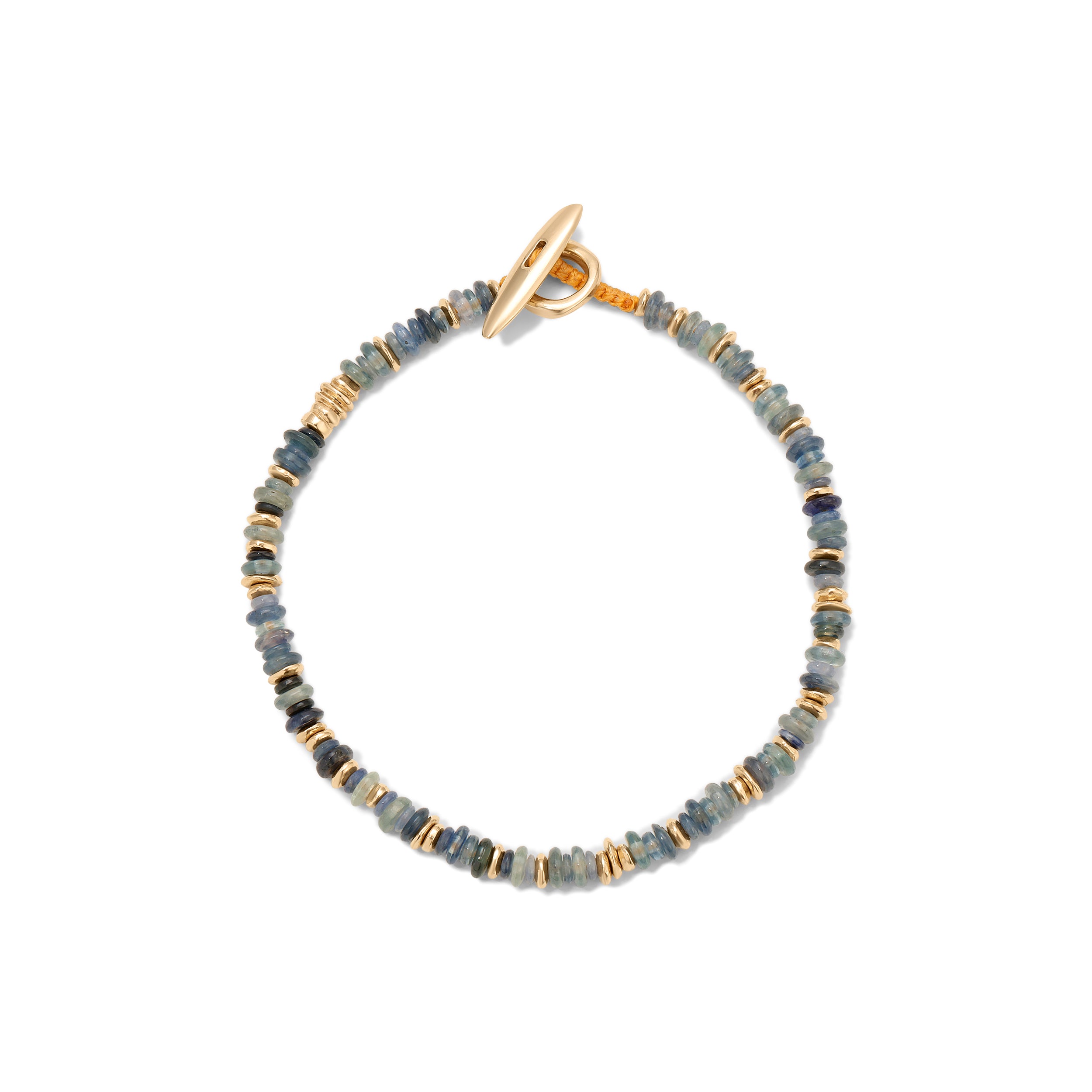 This bracelet features a mix of sapphire and 18k yellow gold beads. Each bracelet reflects unique colors and patterns of the gemstone, making it a one-of-a-kind piece. Add a touch of elegance and sophistication to any outfit with the Pillon Bracelet.