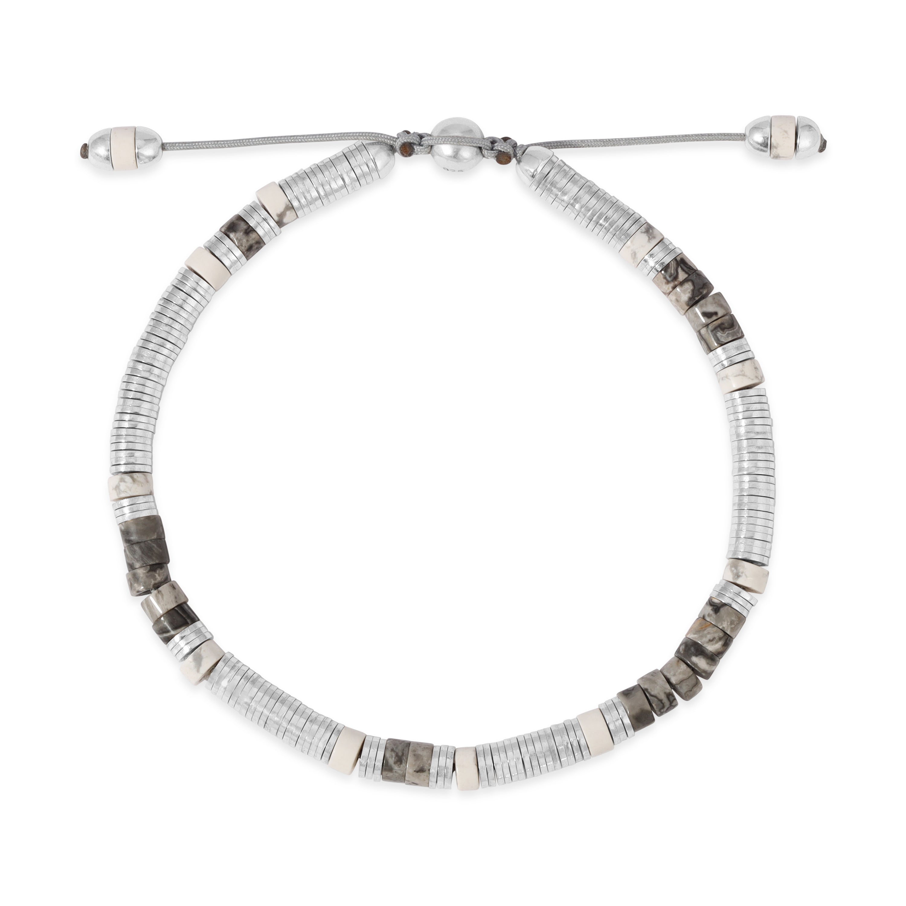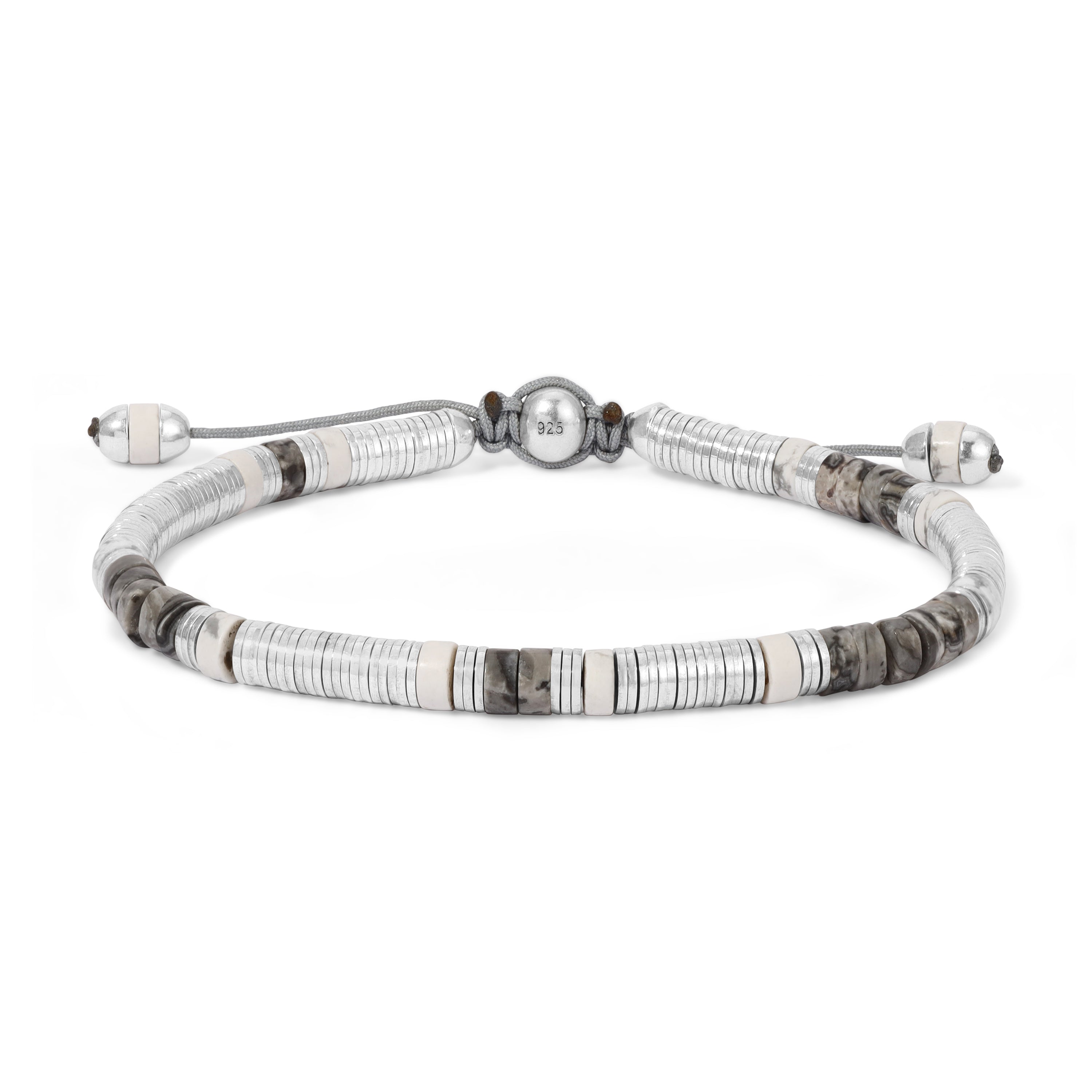 This new twist on classic M Cohen design gives new life to a texture as bold as it is casual. The solid 925 sterling silver discs with Grey Map stones gemstones are expertly crafted into a beautiful pattern. It is intended to be worn to add color to any stack of complementary pieces.