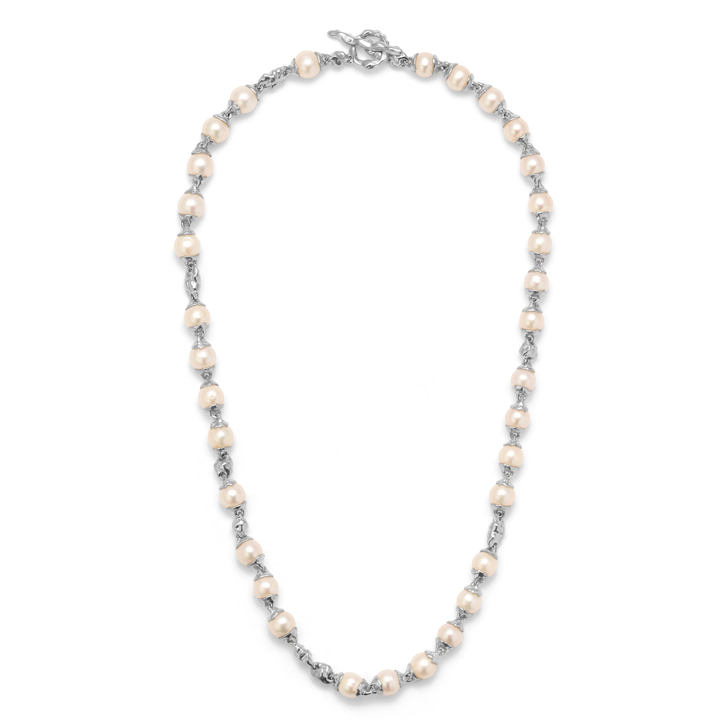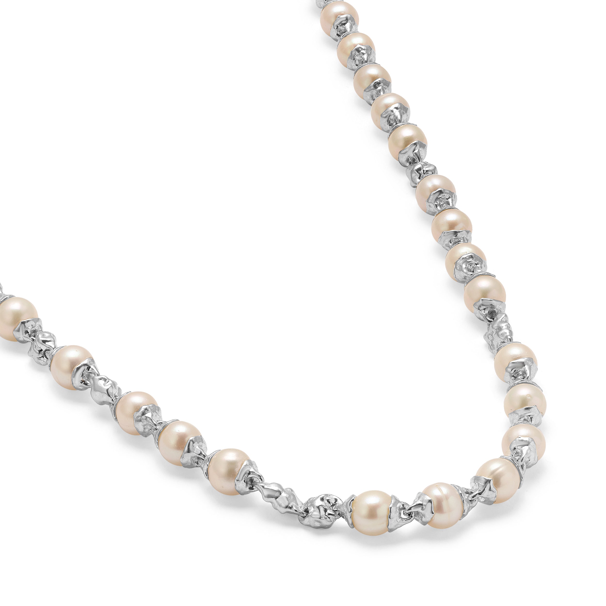 The Raigh Necklace features a mix of solid 925 sterling silver nuggets and 8mm white pearls, creating a sophisticated and elegant piece. Crafted with care, this necklace showcases timeless beauty and versatile style, perfect for any occasion. Upgrade your jewelry collection with the Raigh Necklace.