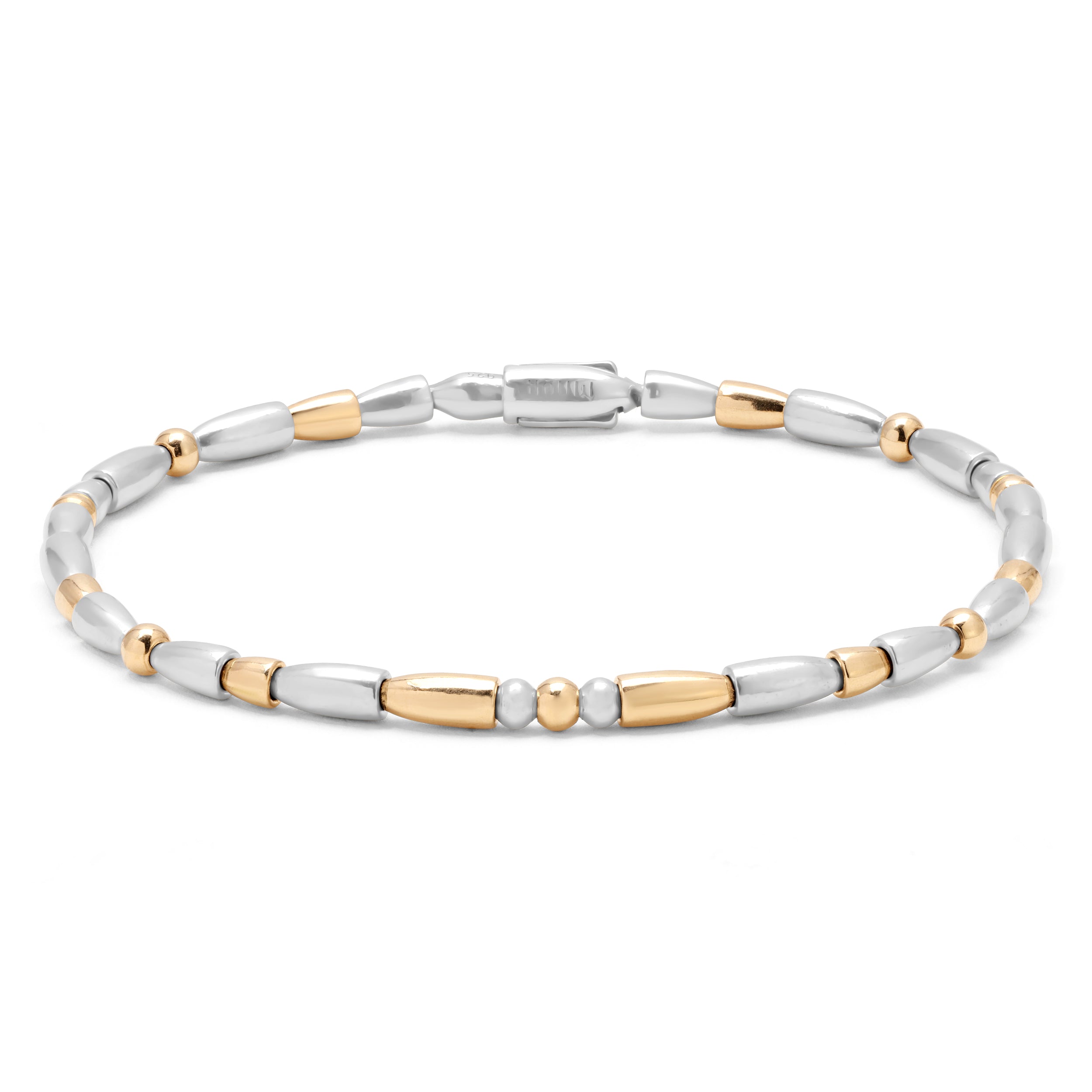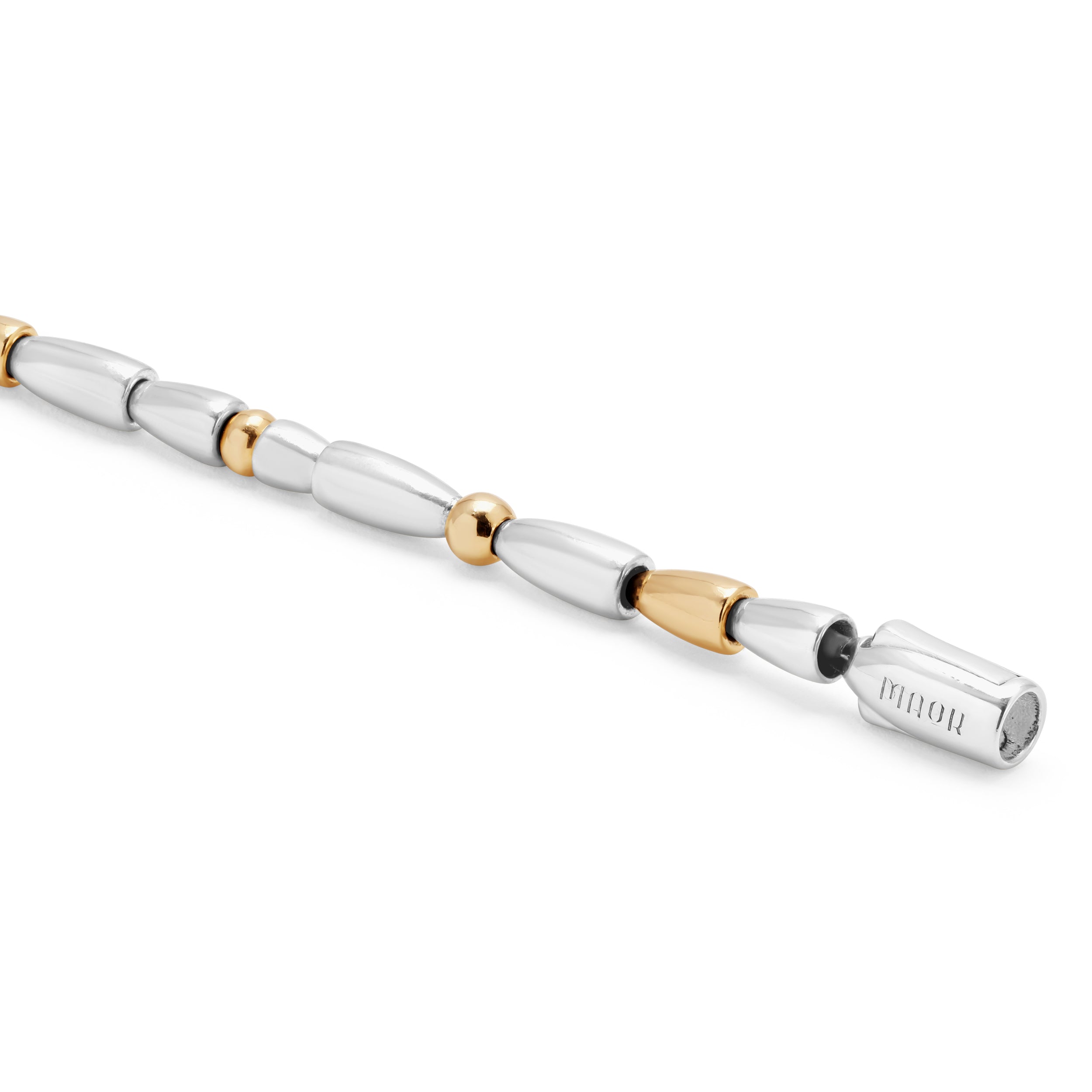 The Totam Bracelet redefines beading with a fresh concept that emphasizes fluid, snake-like movement. Crafted from a sophisticated blend of sterling silver and 18k yellow gold, this mixed metal piece seamlessly integrates contrasting tones for a refined, modern look. Designed to interlock smoothly, it offers both visual intrigue and elegant flexibility, making it a standout accessory for those who appreciate expert craftsmanship and innovative design.